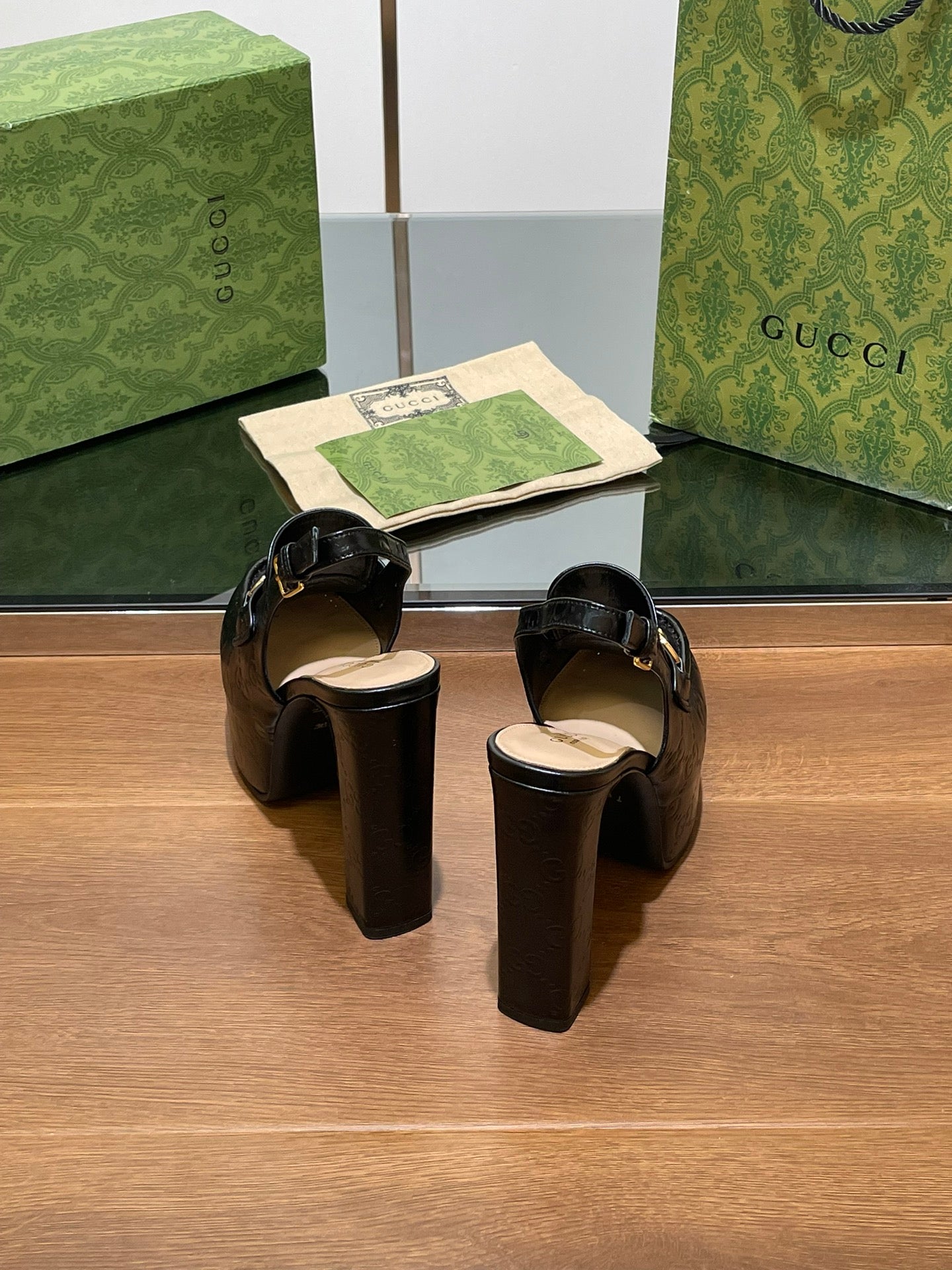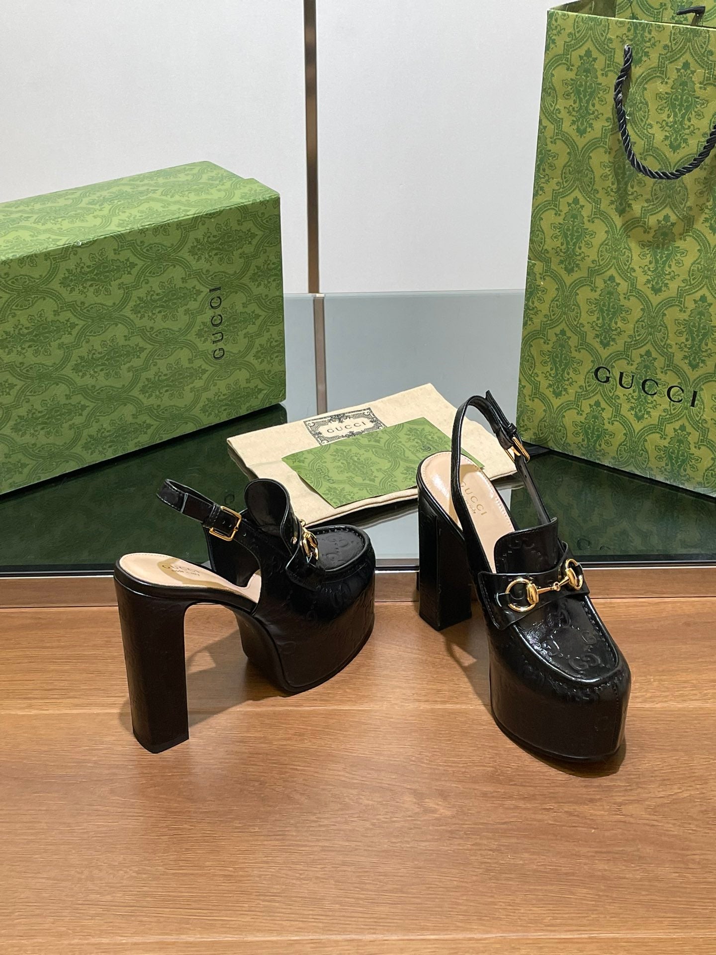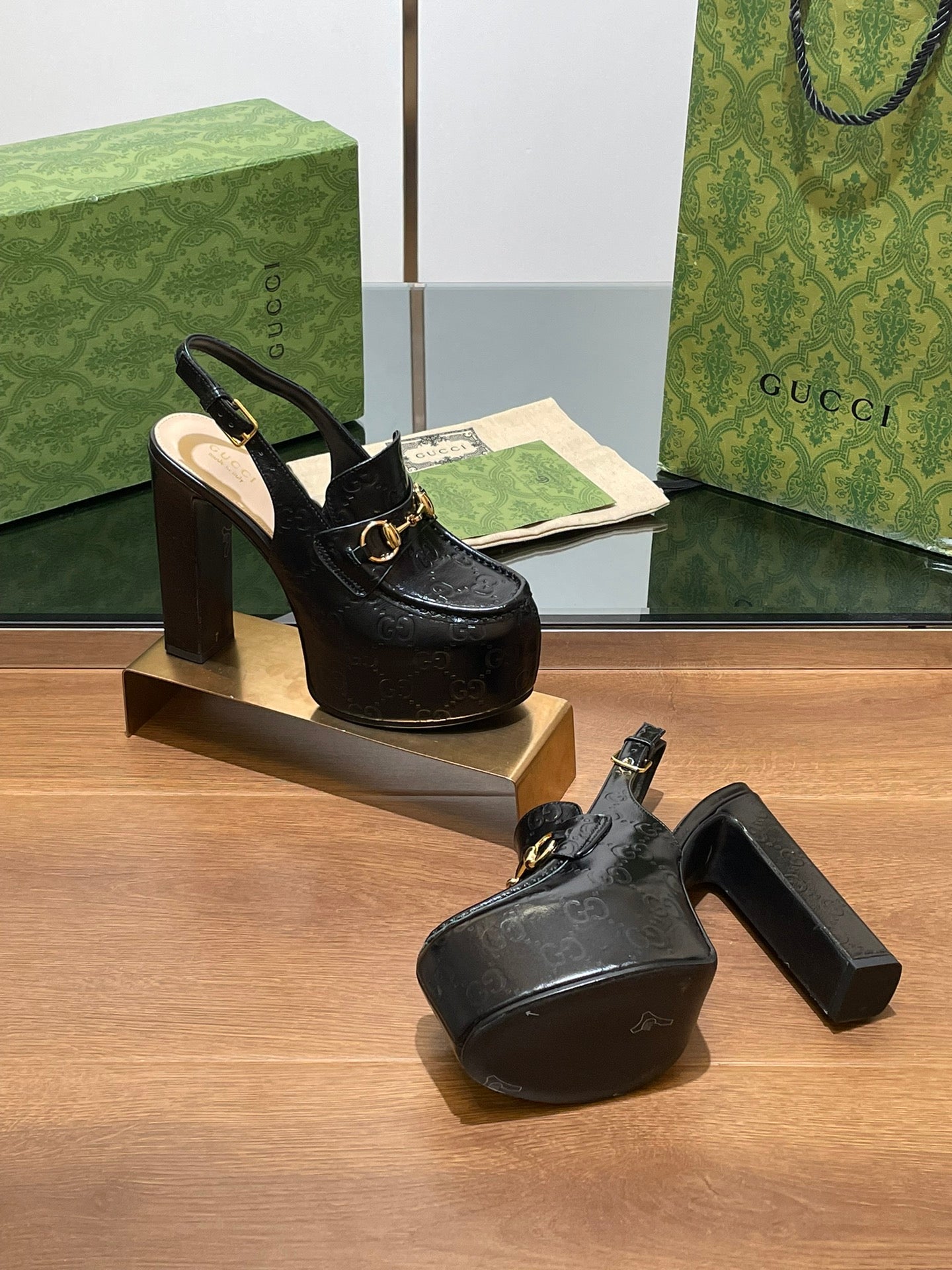 GG WOMEN'S HORSEBIT PLATFORM SLINGBACK IN BLACK CALFSKIN