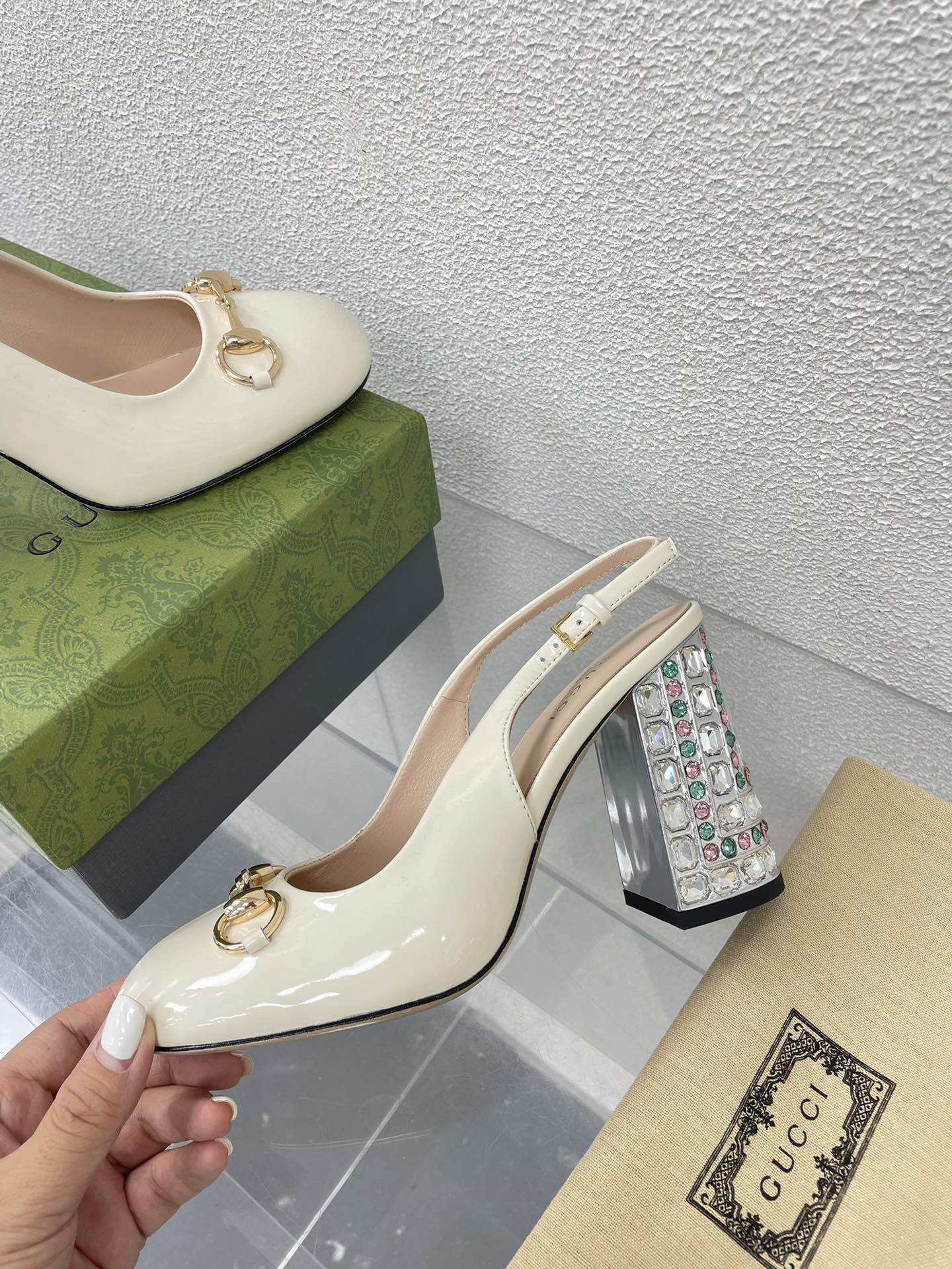 GG WOMEN'S HORSEBIT SLINGBACK 95MM IN WHITE CALFSKIN WITH RHINSTONES