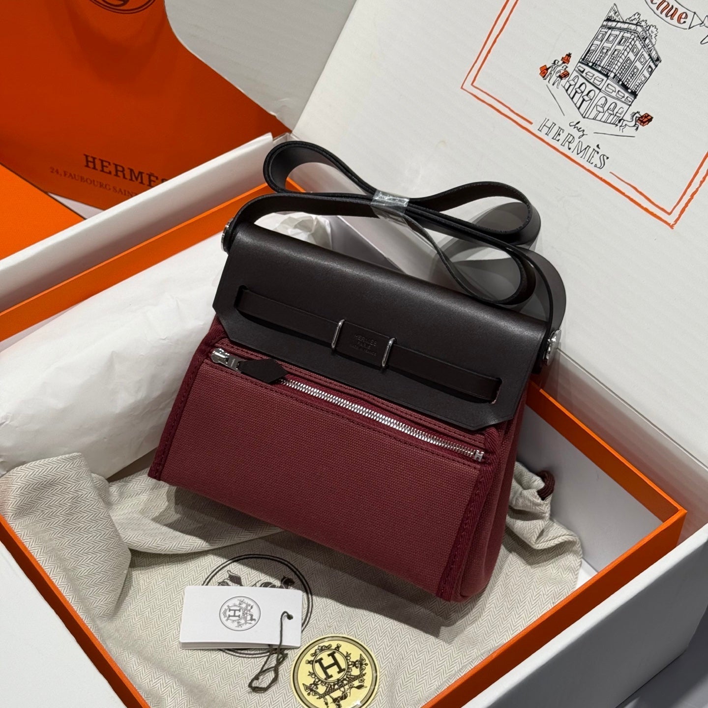 HM Mini Herbag Silver Buckle 20 Burgundy Canvas and Hunter Cowhide 243250
