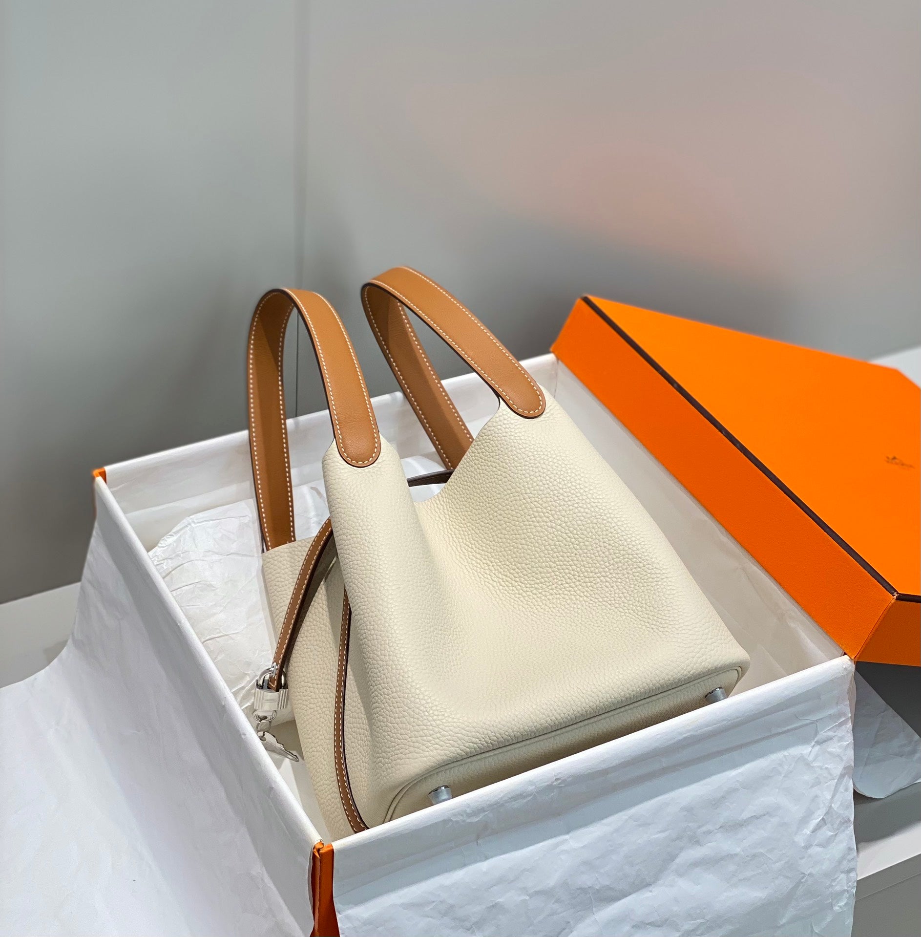 HM PICOTIN LOCK 22 WHITE AND BROWN TOGO LEATHER