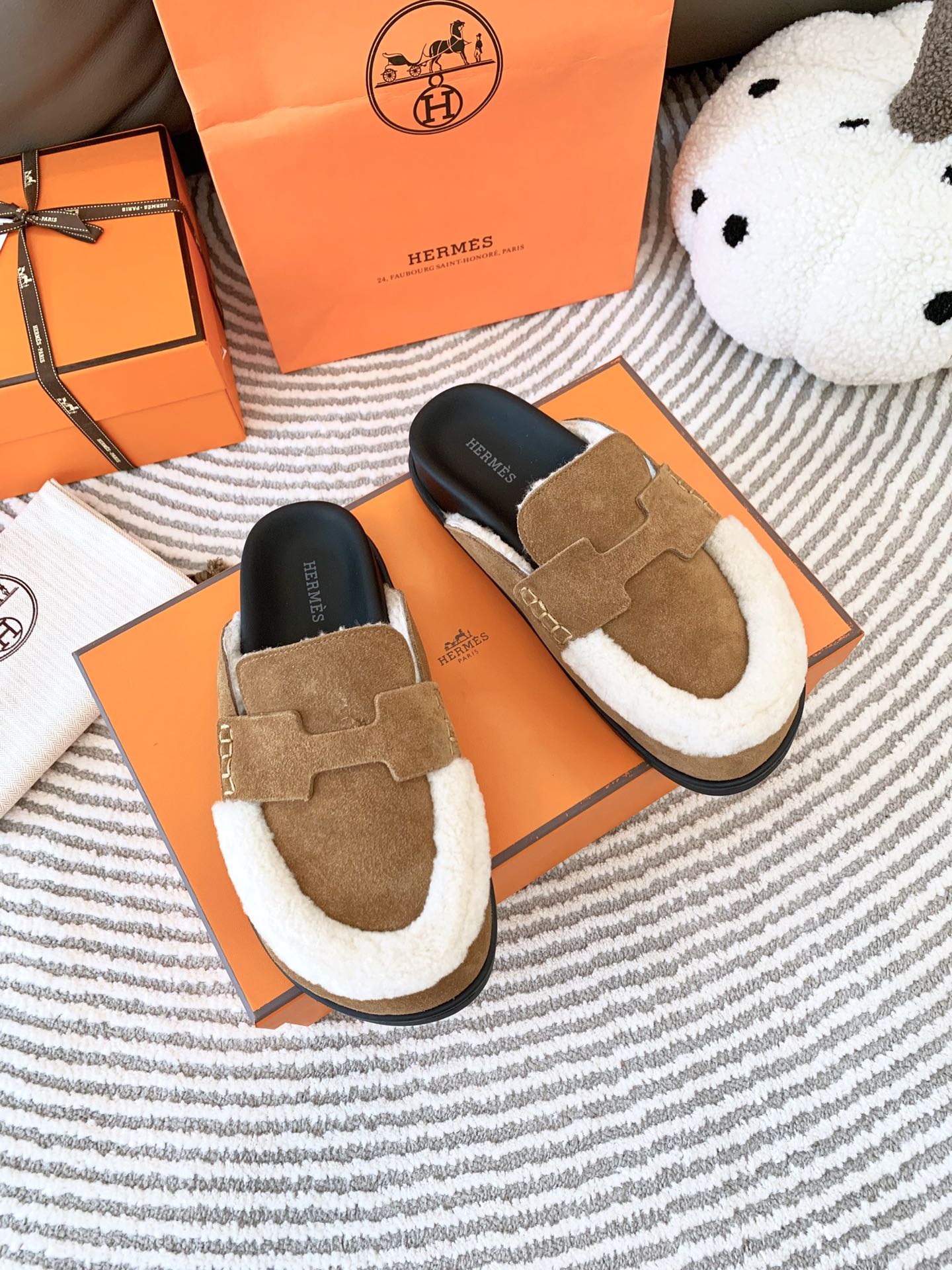 HM Go Mule Brown Mix White Suede Lined With Wool Fleece 963222