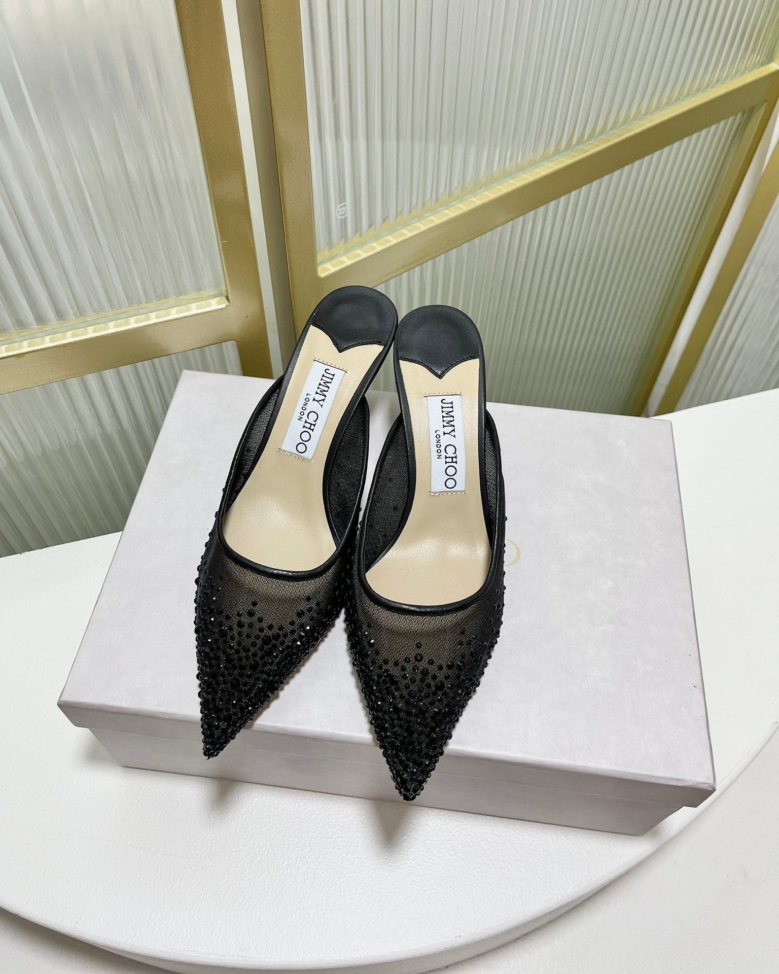 Jimmy Mule 65mm In Black Mesh Fabric With Swarovski Crystal 597875