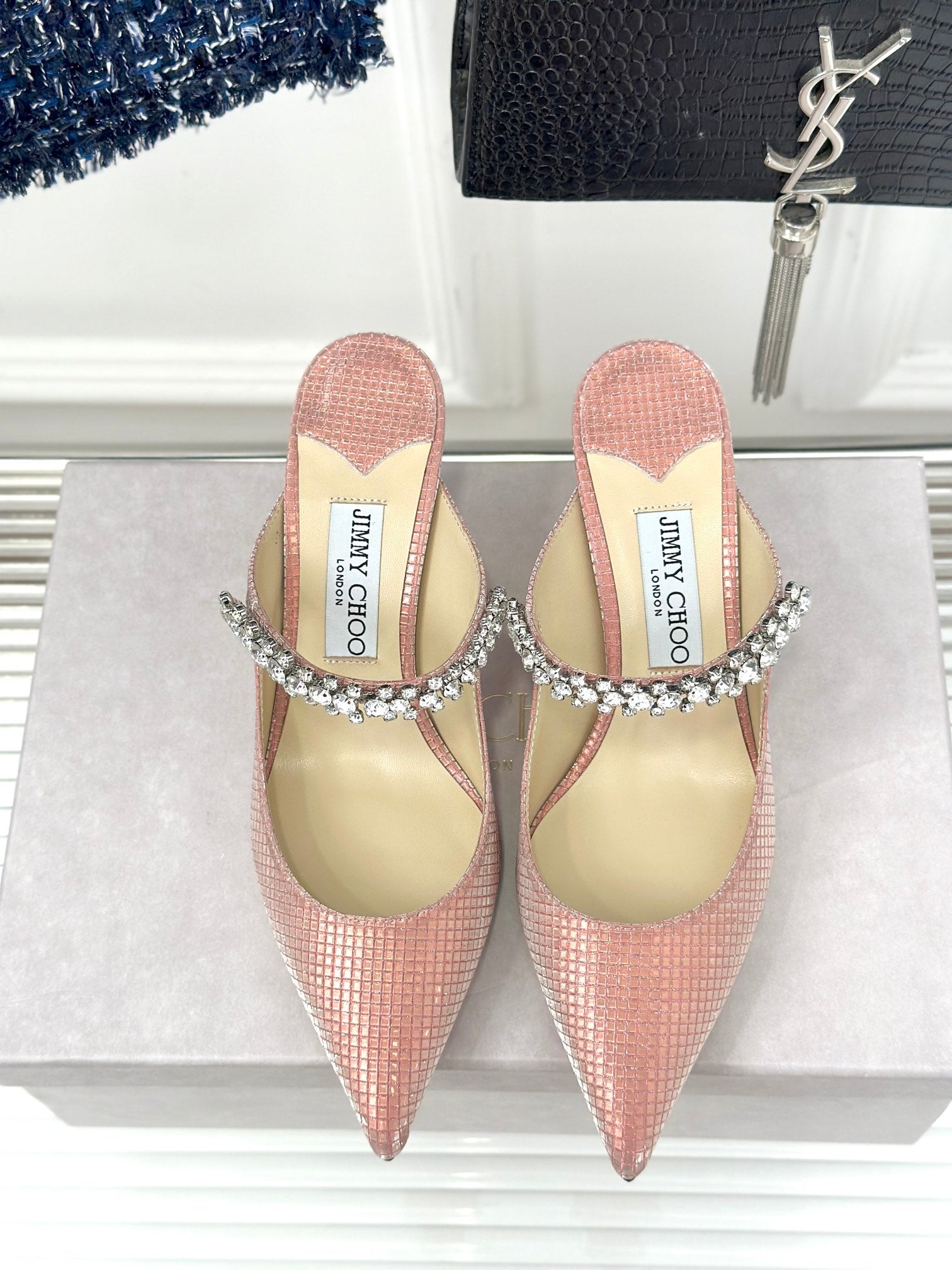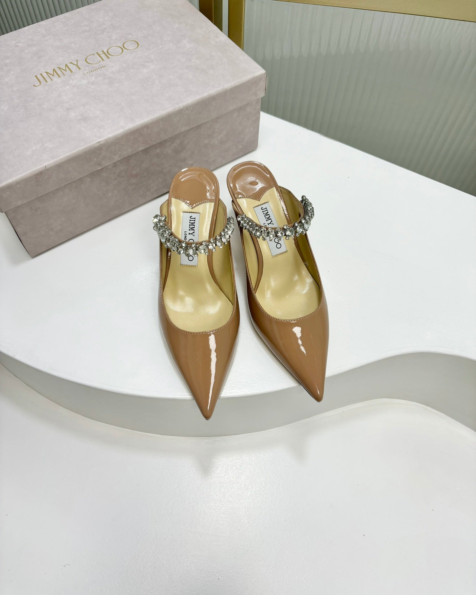 Jimmy Anise 85 In Light Pink Beige Glossy Cowhide Mules 587690