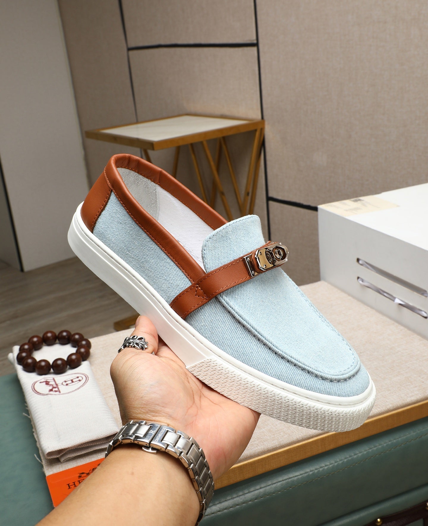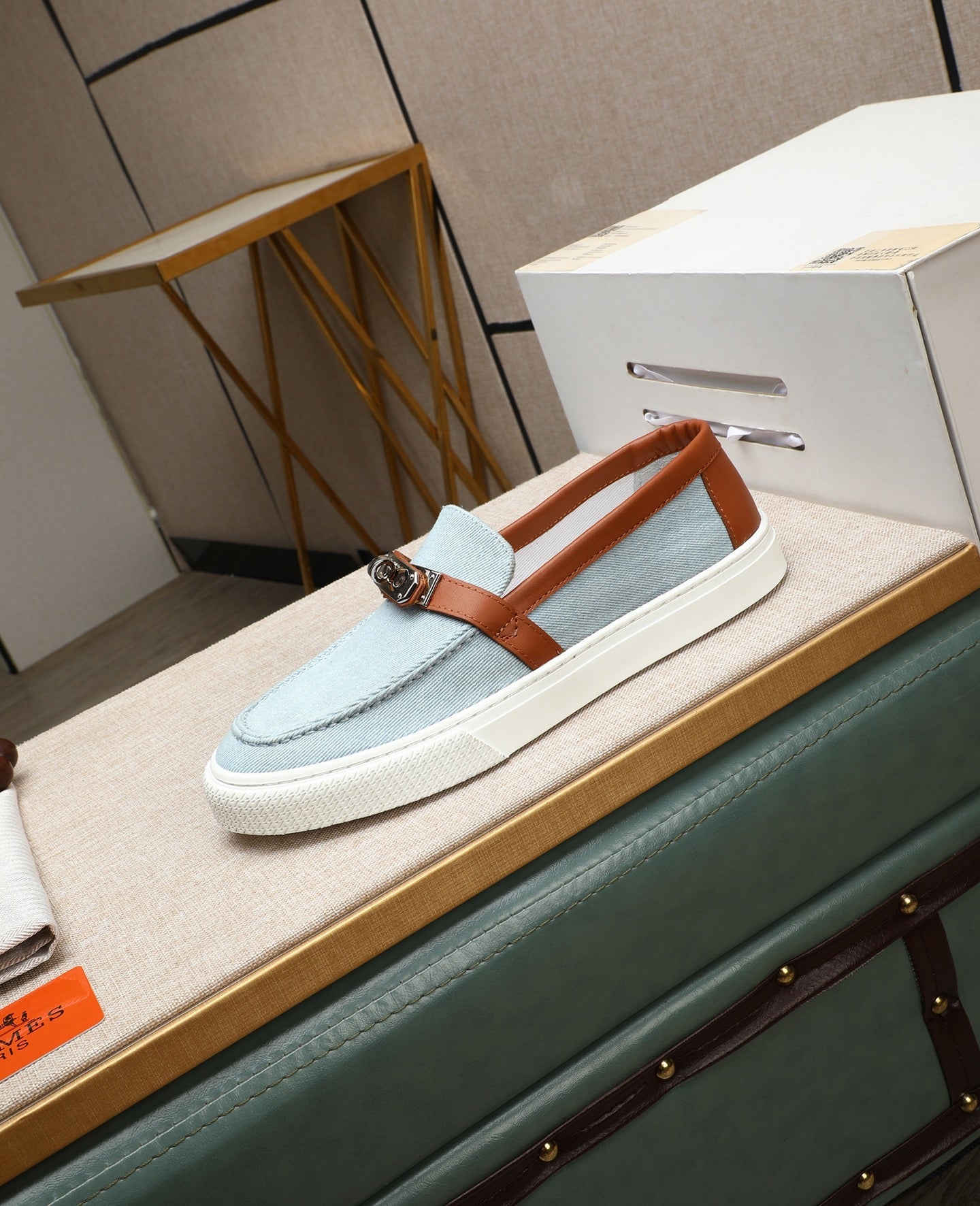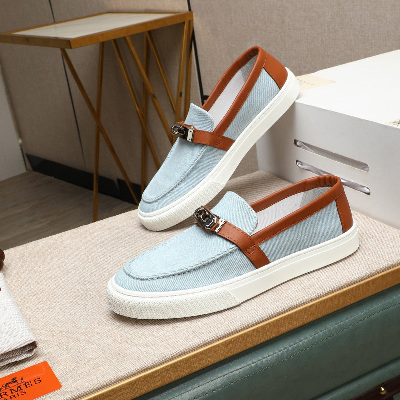 HM Men's Game Slip-on Blue Brown Denim Cowhide 712266