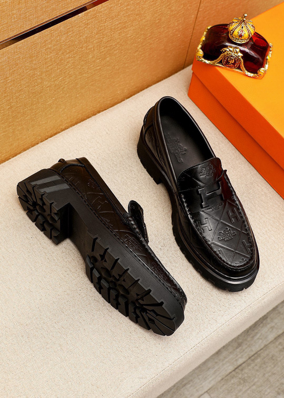 HM Men's Moccasins Loafer Black Calfskin Embossed 710912