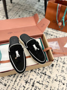 Loro Piana Black White Suede Charms Walk Flat Mules