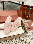 Loro Piana Light Pink White Suede Charms Walk Flat Mules