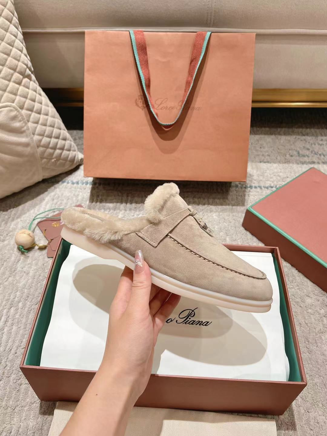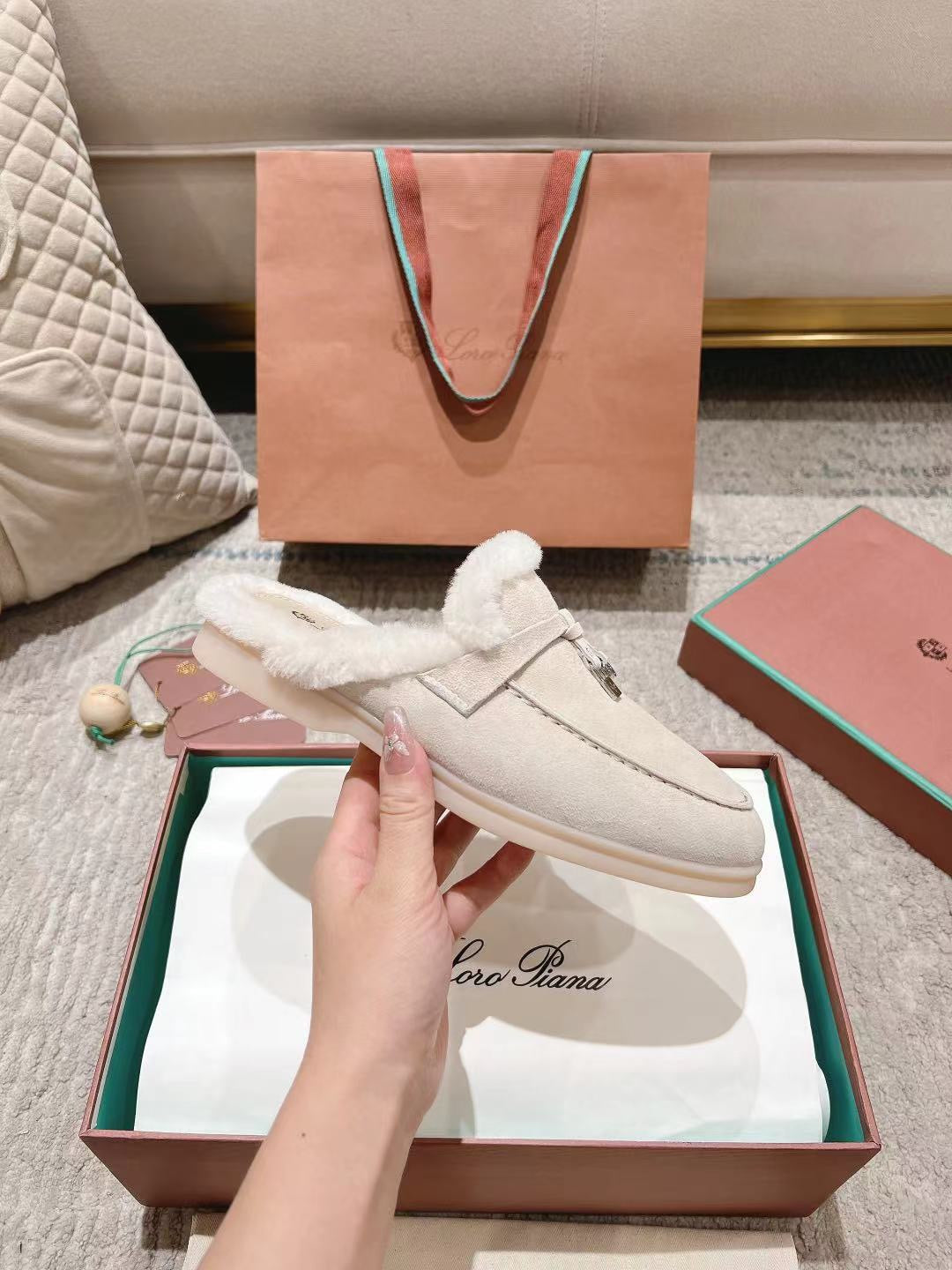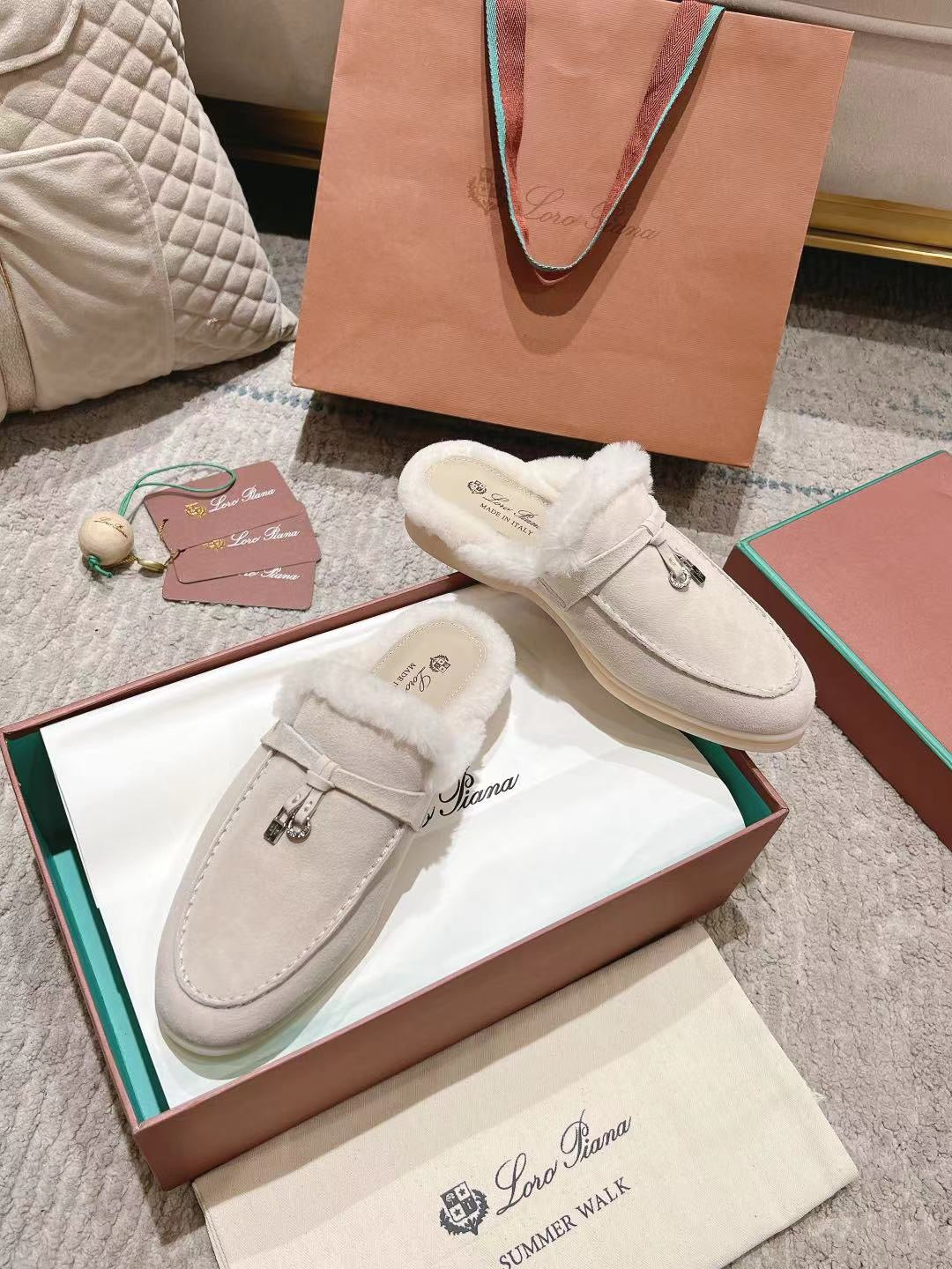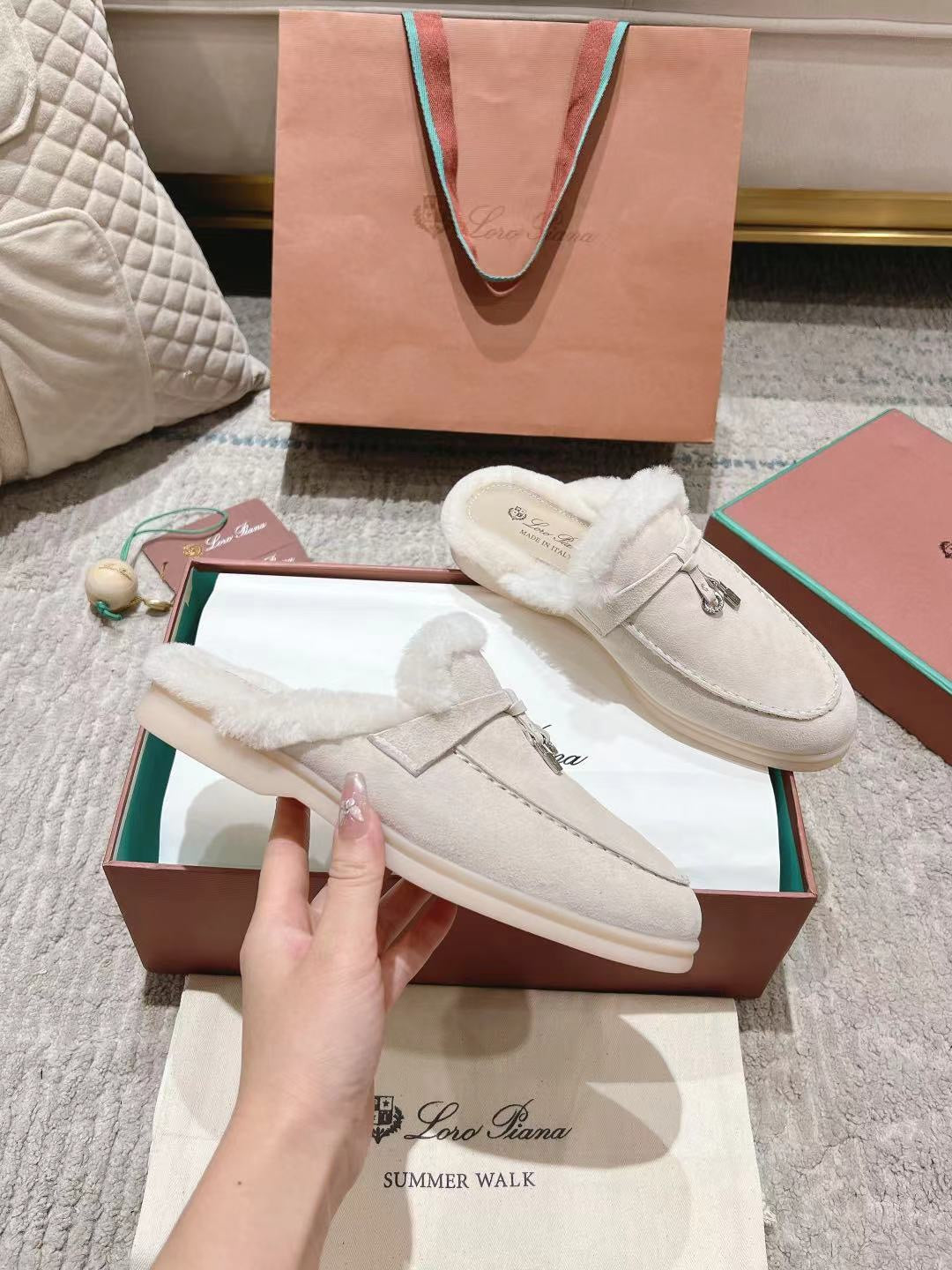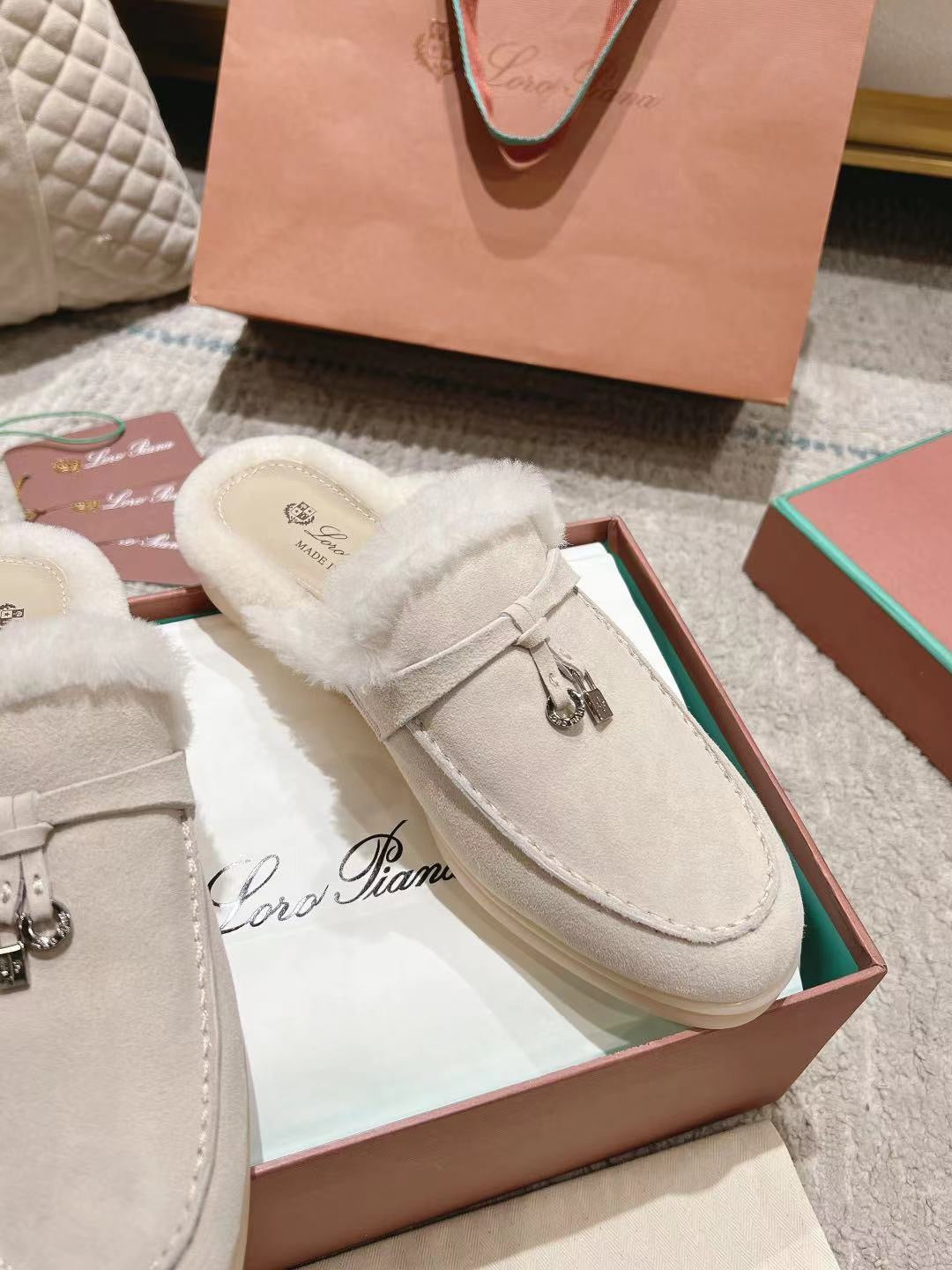 LP Charms Walk Babouche Loafer Bisque Cream mix White Suede With Rabbit Fur Lining 206243