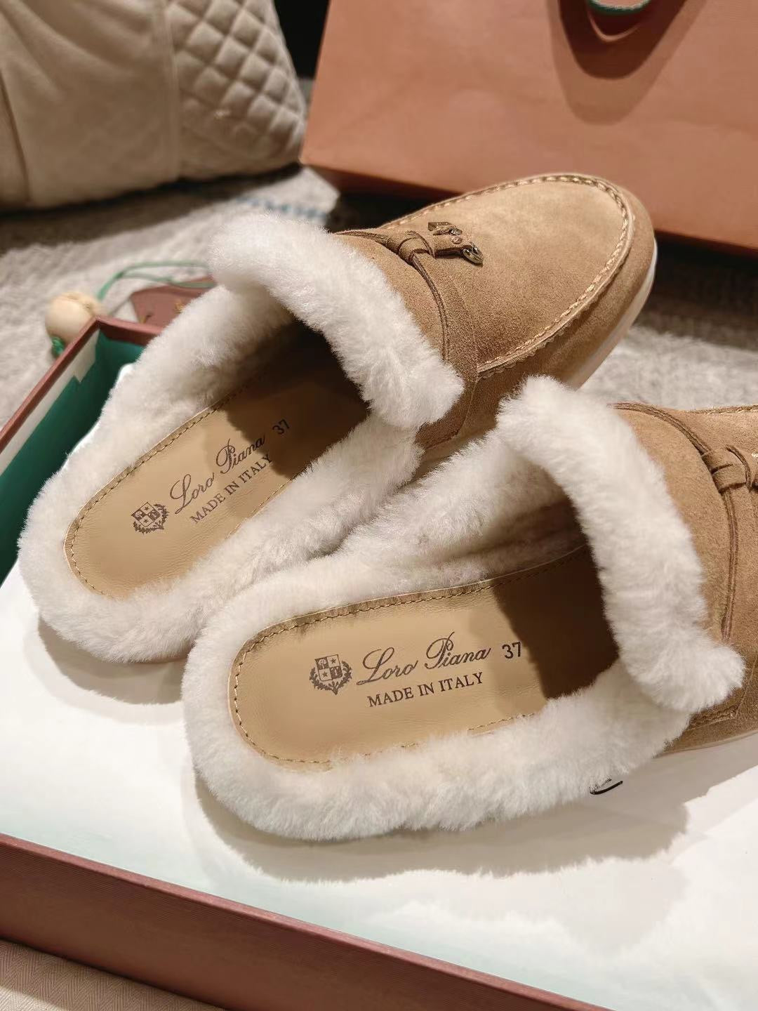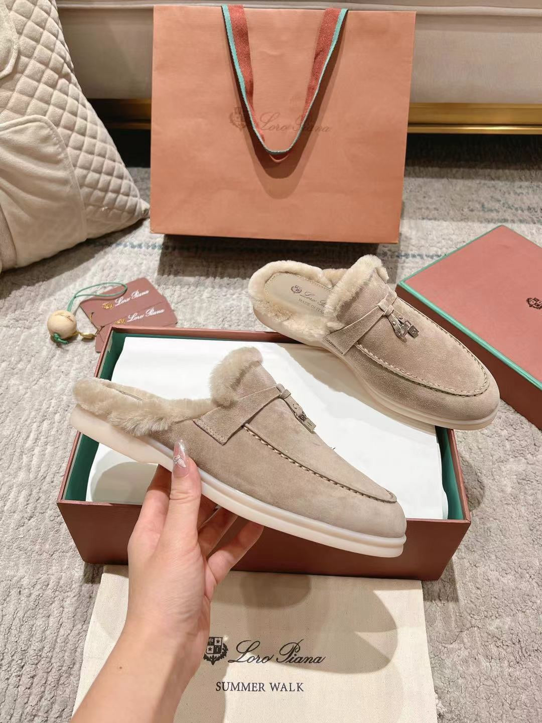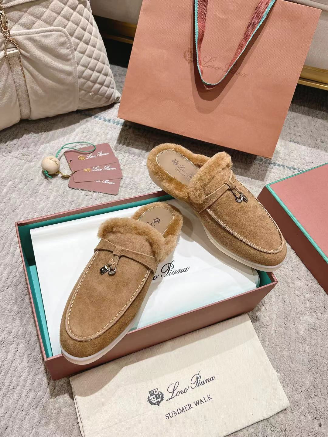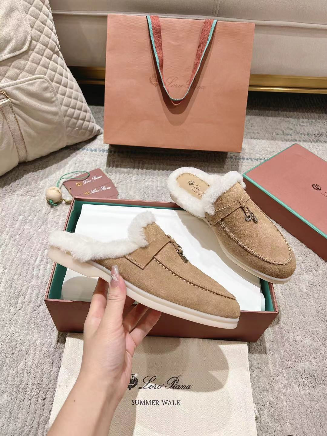 LP Summer Charms Walk Loafers Light Brown Beige Mix White Suede With Rabbit Fur Lining 206250