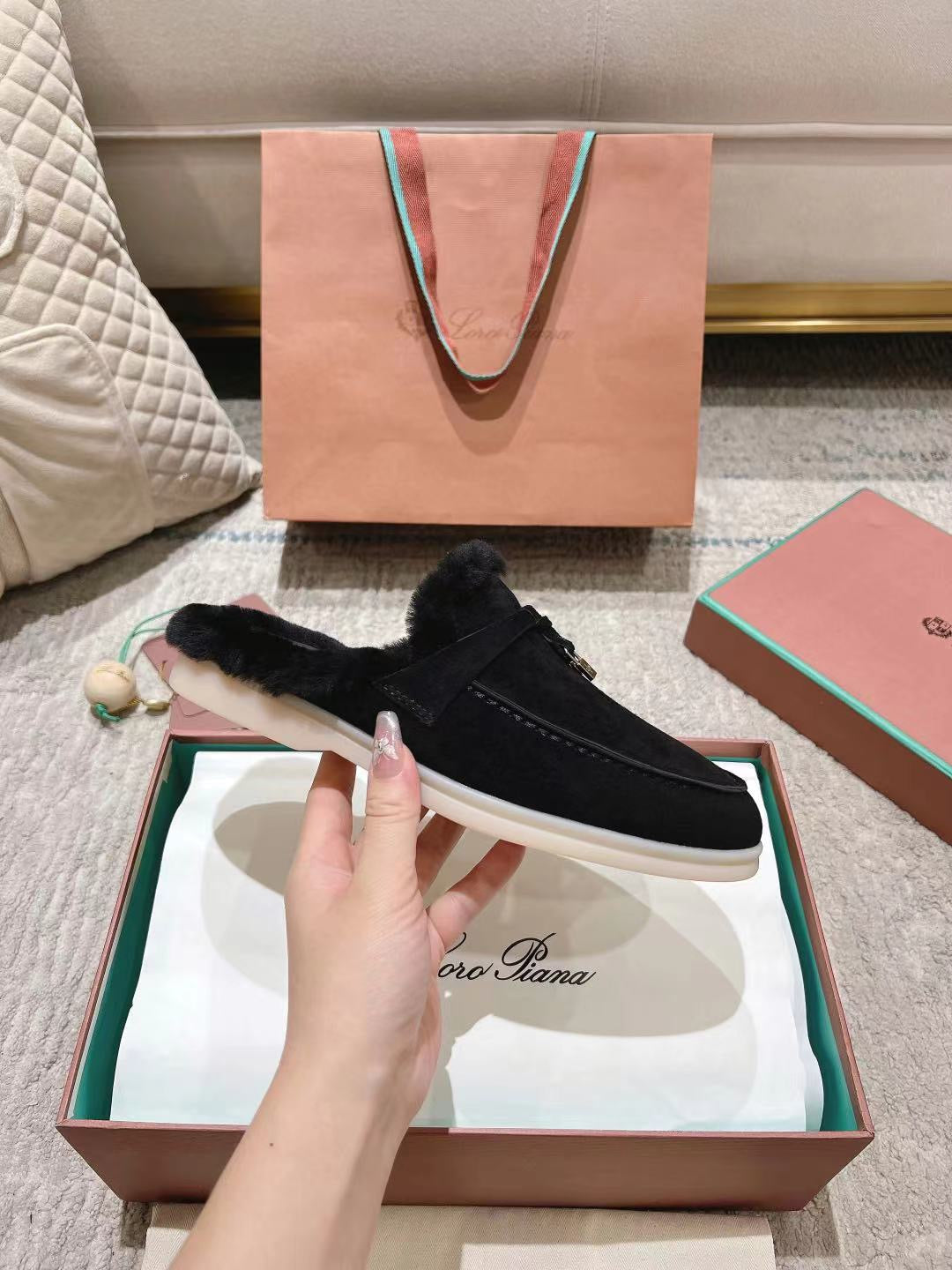 LP Charms Walk Babouche Loafer Black Suede With Rabbit Fur Lining 206239