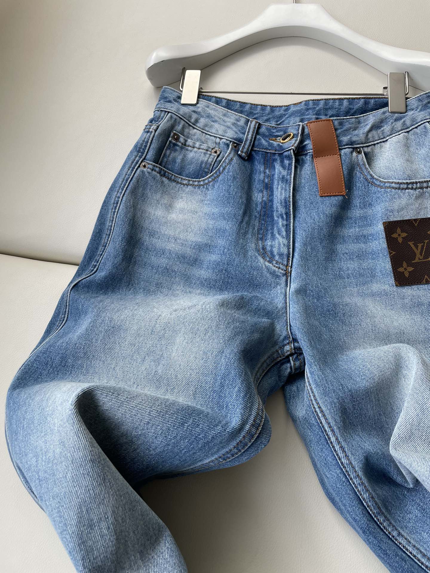 LV Flower Leather Label Straight Jeans Blue Cotton