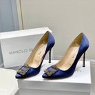 Manolo Diamond Buckle Pumps 10cm Navy Blue Silk 327497