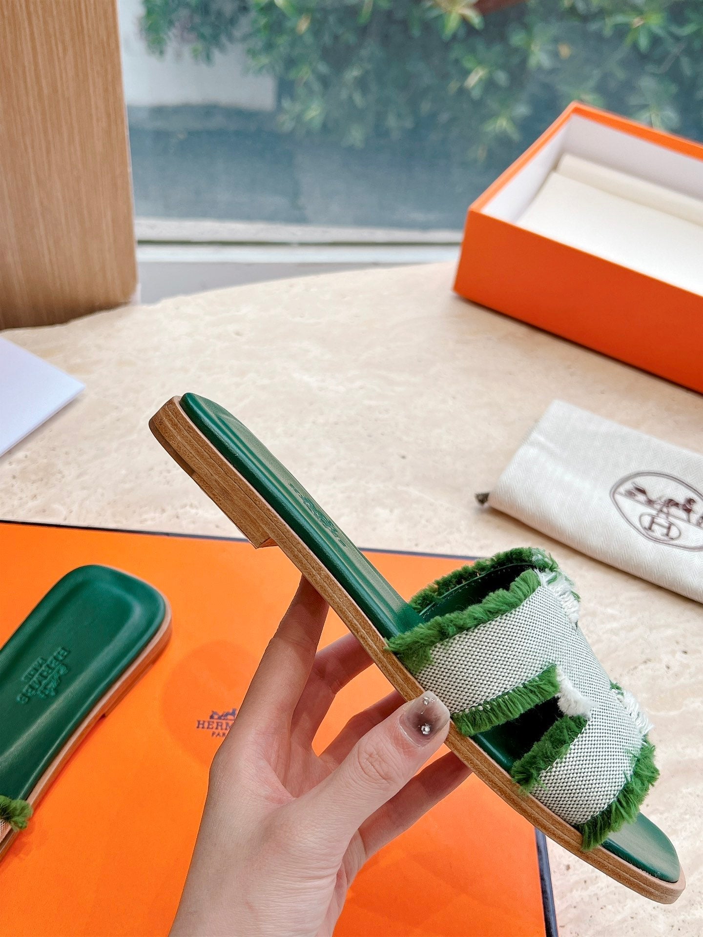 HM 25 Oran Sandal Green Calfskin White Denim