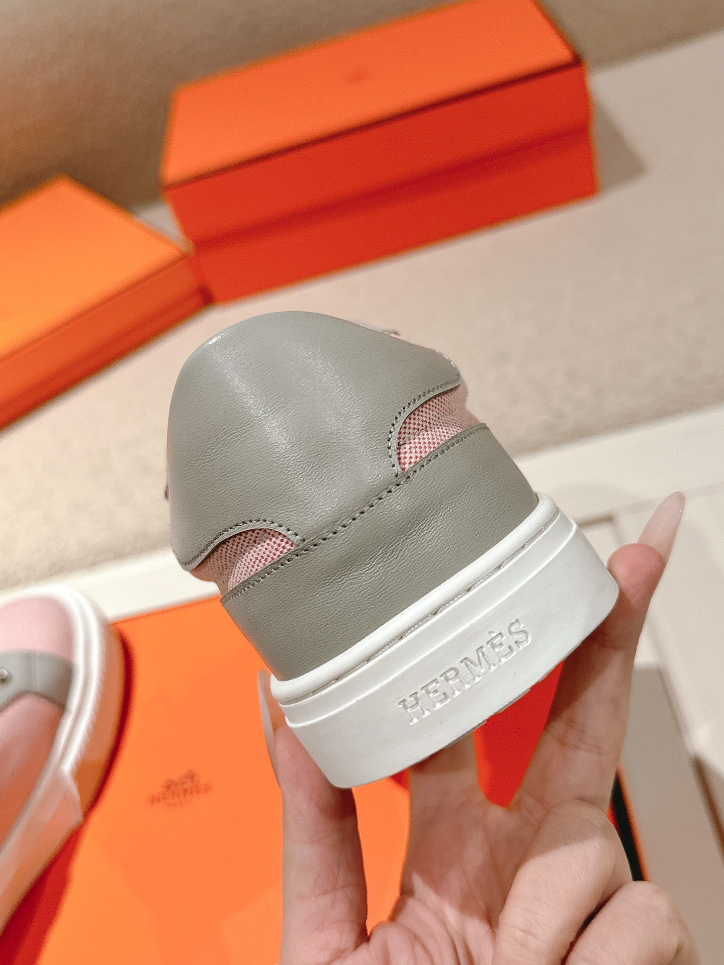 HM 25ss Kelly Buckle Sneakers Pink Gray Cowhide Canvas 577488