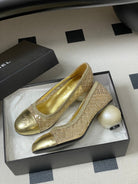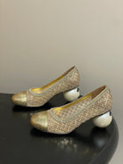 CC 26 Beaded Sequin Pump With Double C Pearl Heel Gold Mesh Leather 593159
