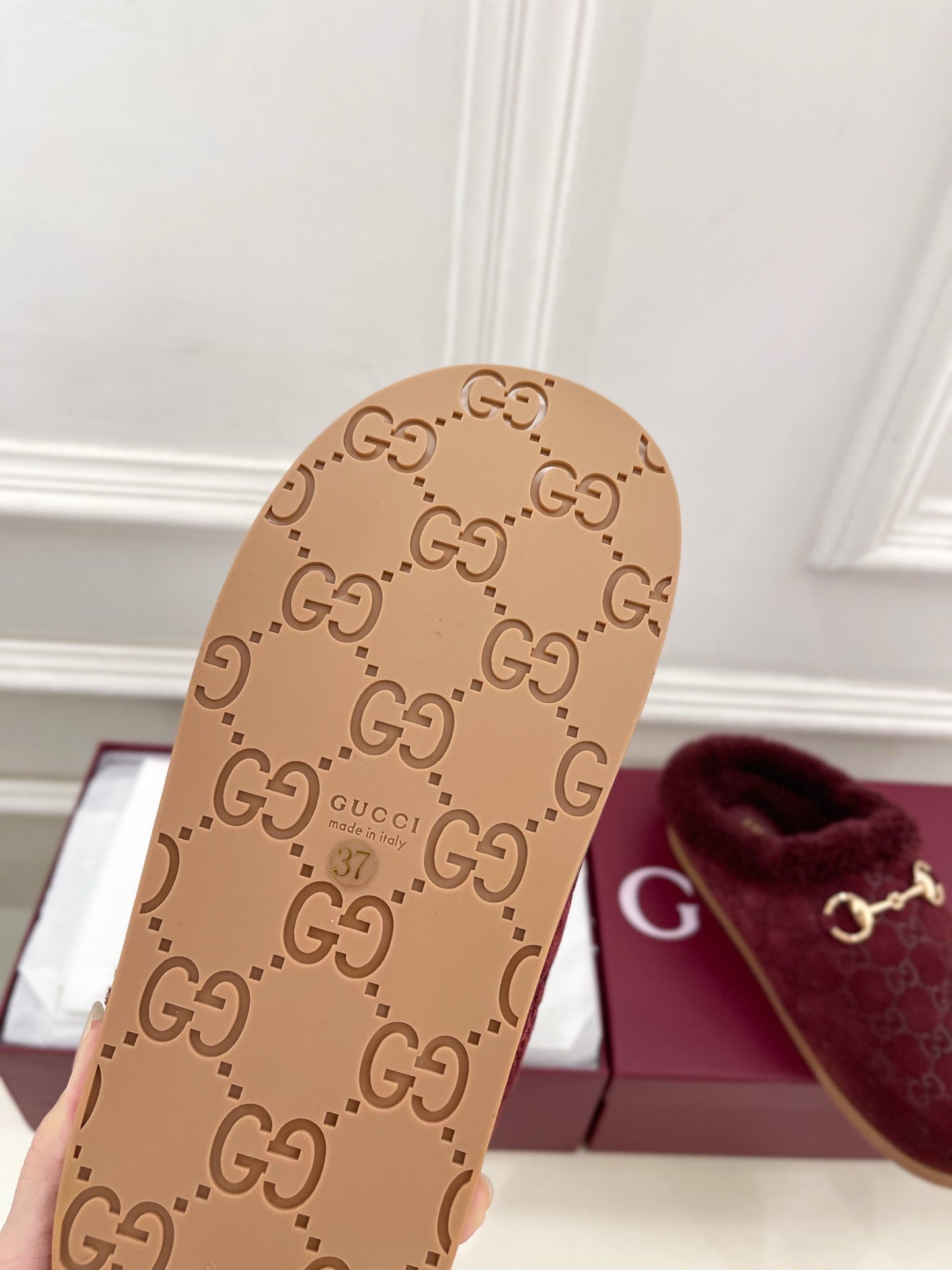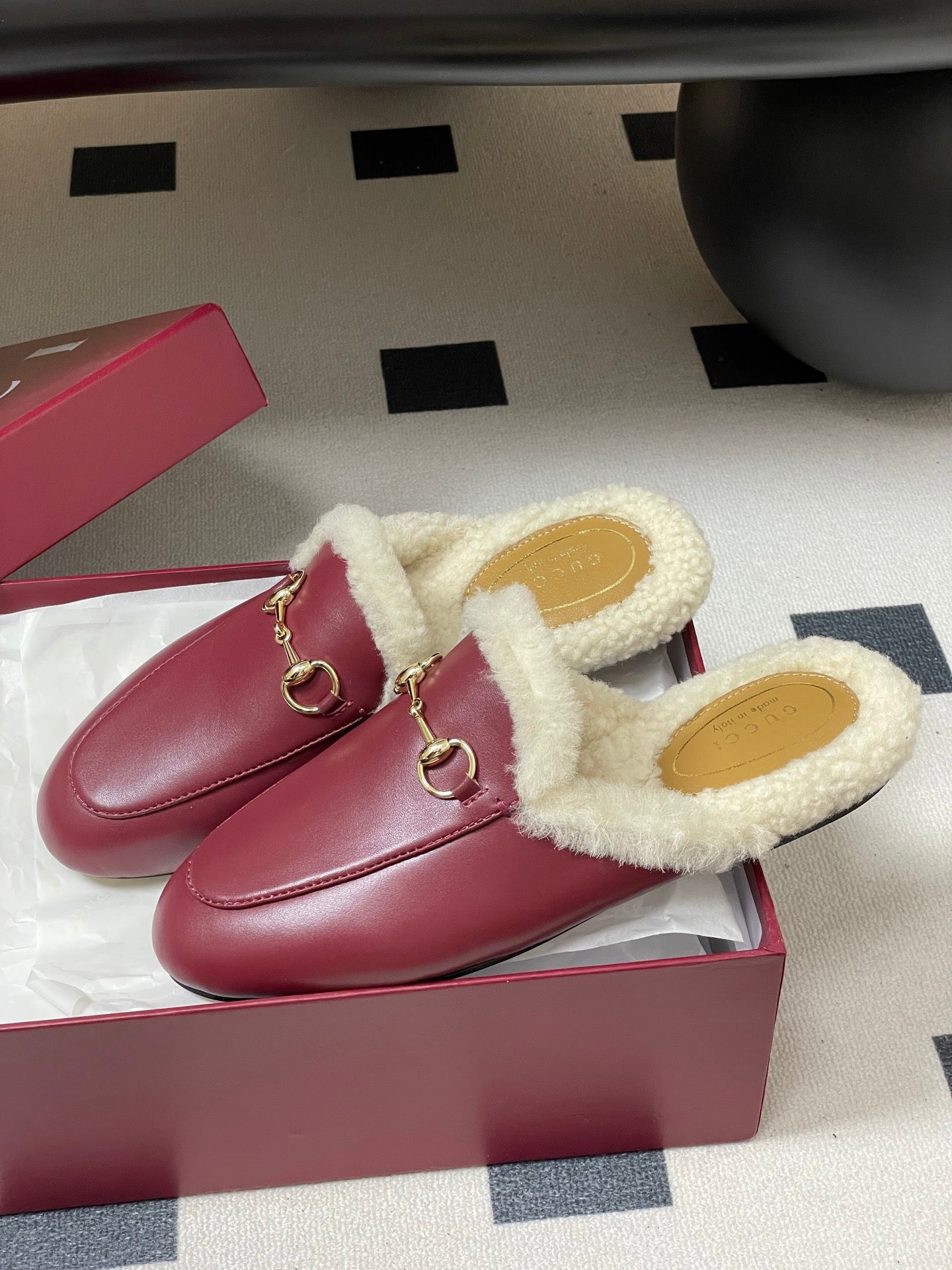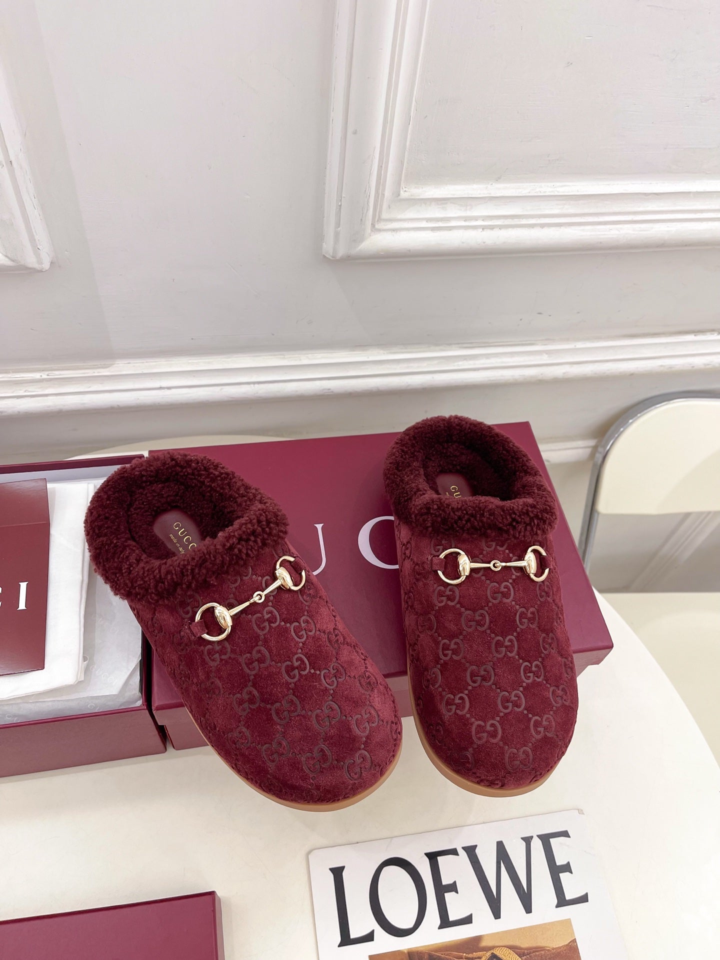 GG horsebit flat mules burgundy suede and wool 534706
