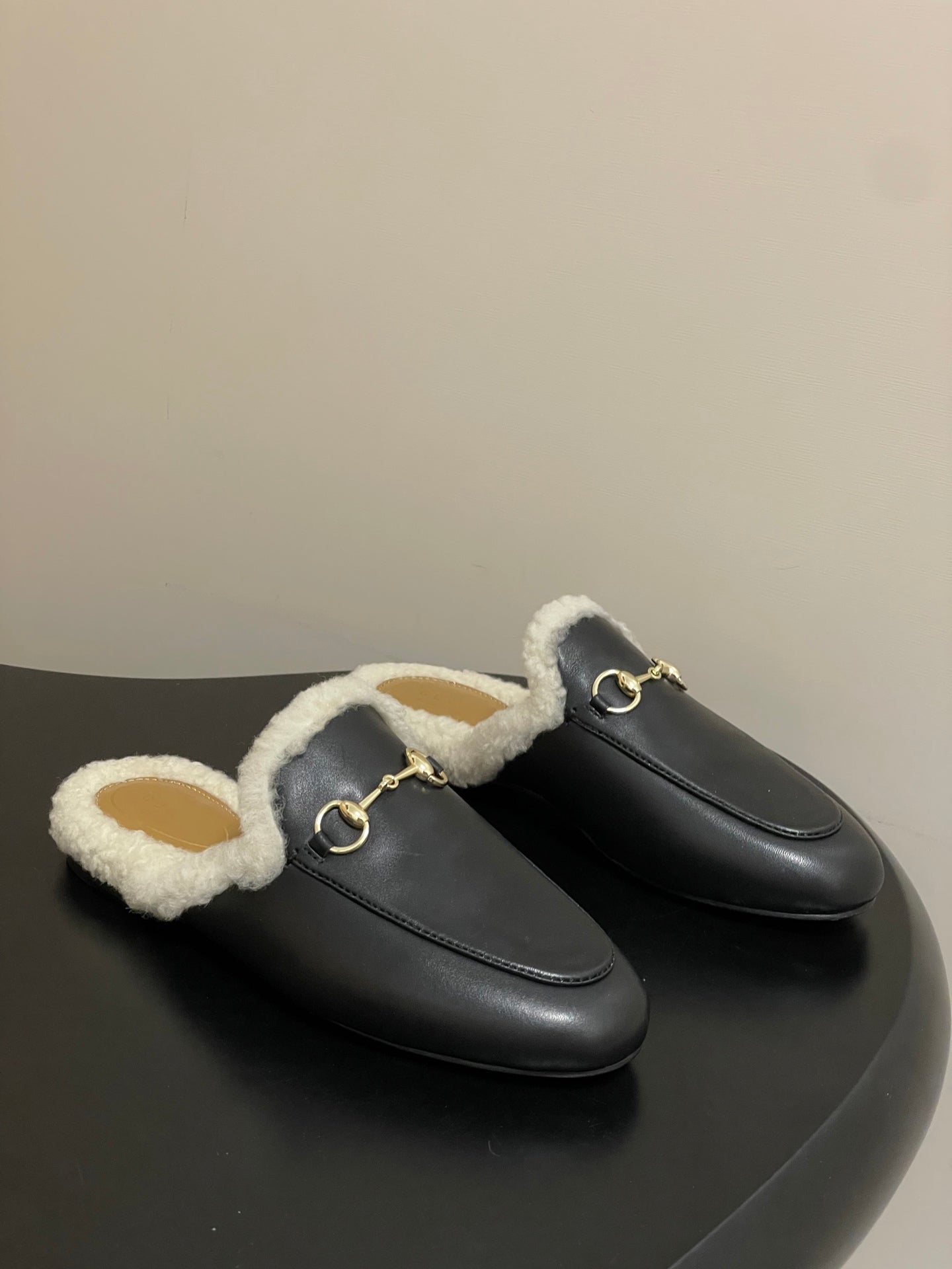 GG horsebit flat mules black suede and wool 534710