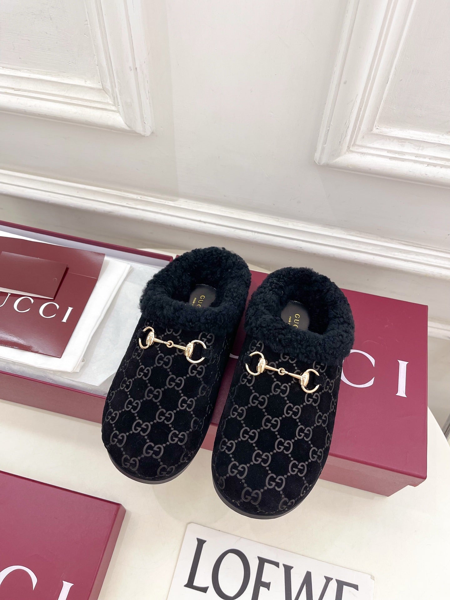 GG Horsebit Embossed Mule Black Suede And Wool 536050