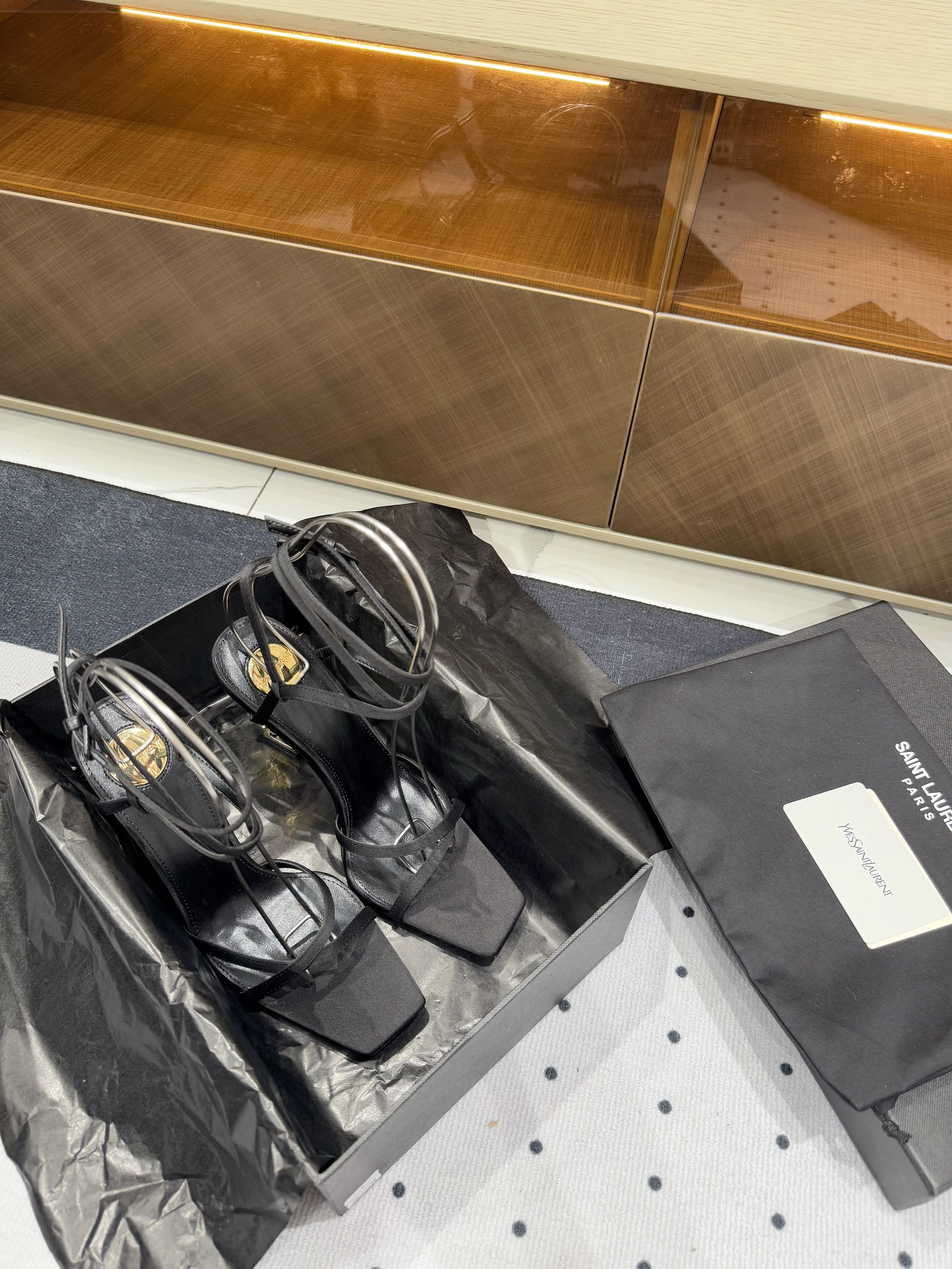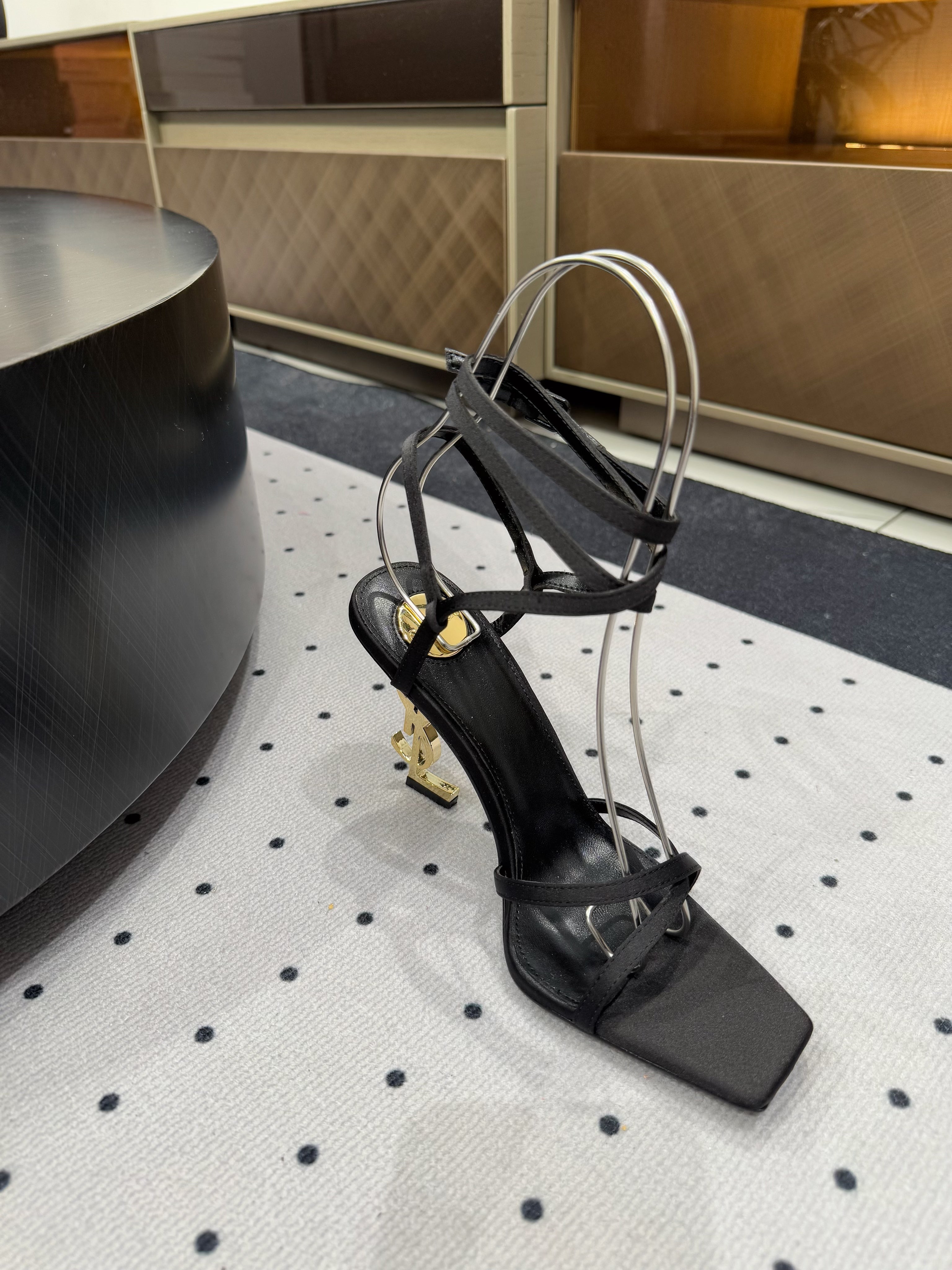 HIGH SANDAL ATTACHED GEM IN BLACK GLOSSY CALFSKIN