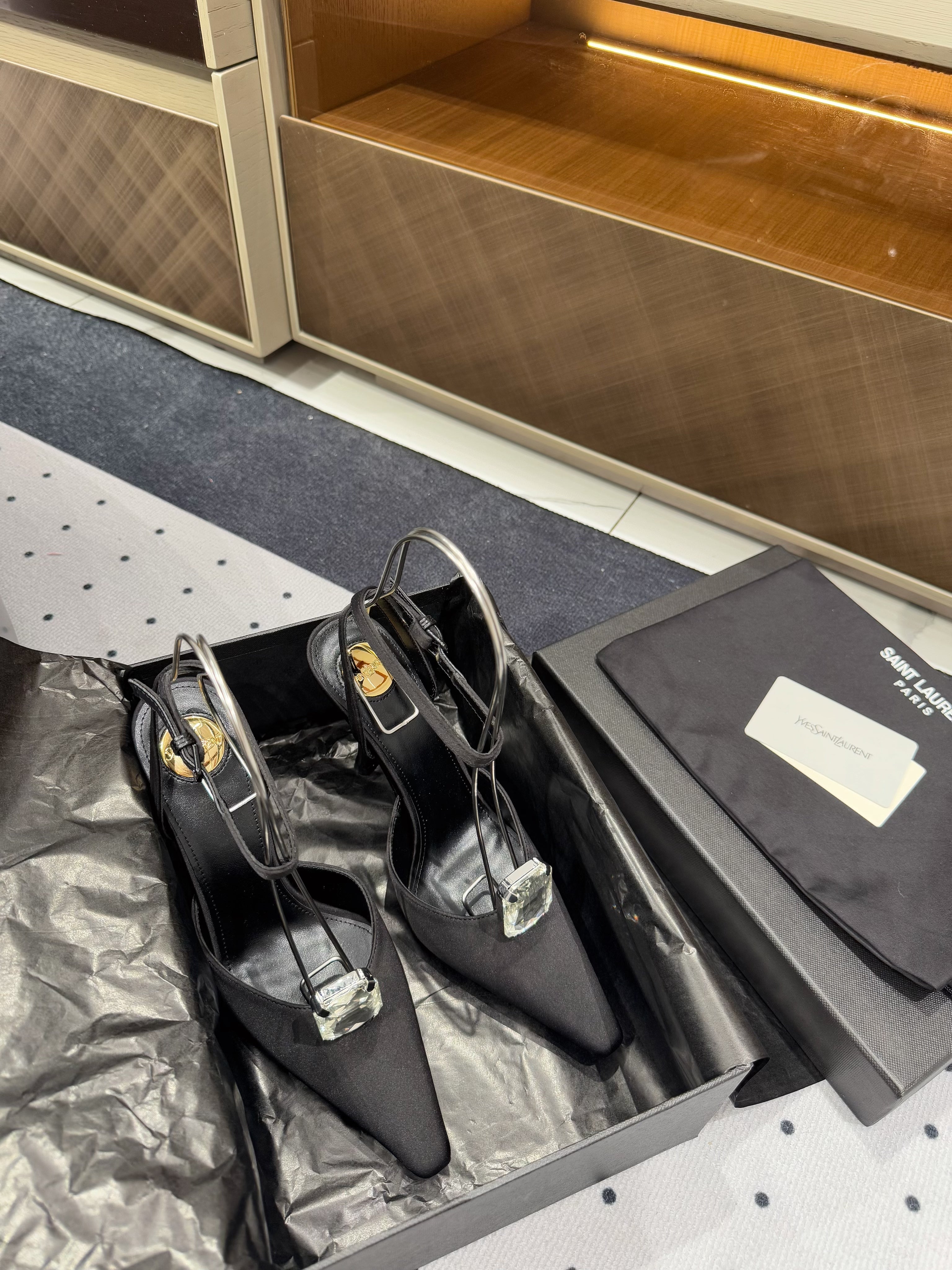 GOLD CHAIN ATTACHED HIGH SLINGBACK IN BLACK SILK