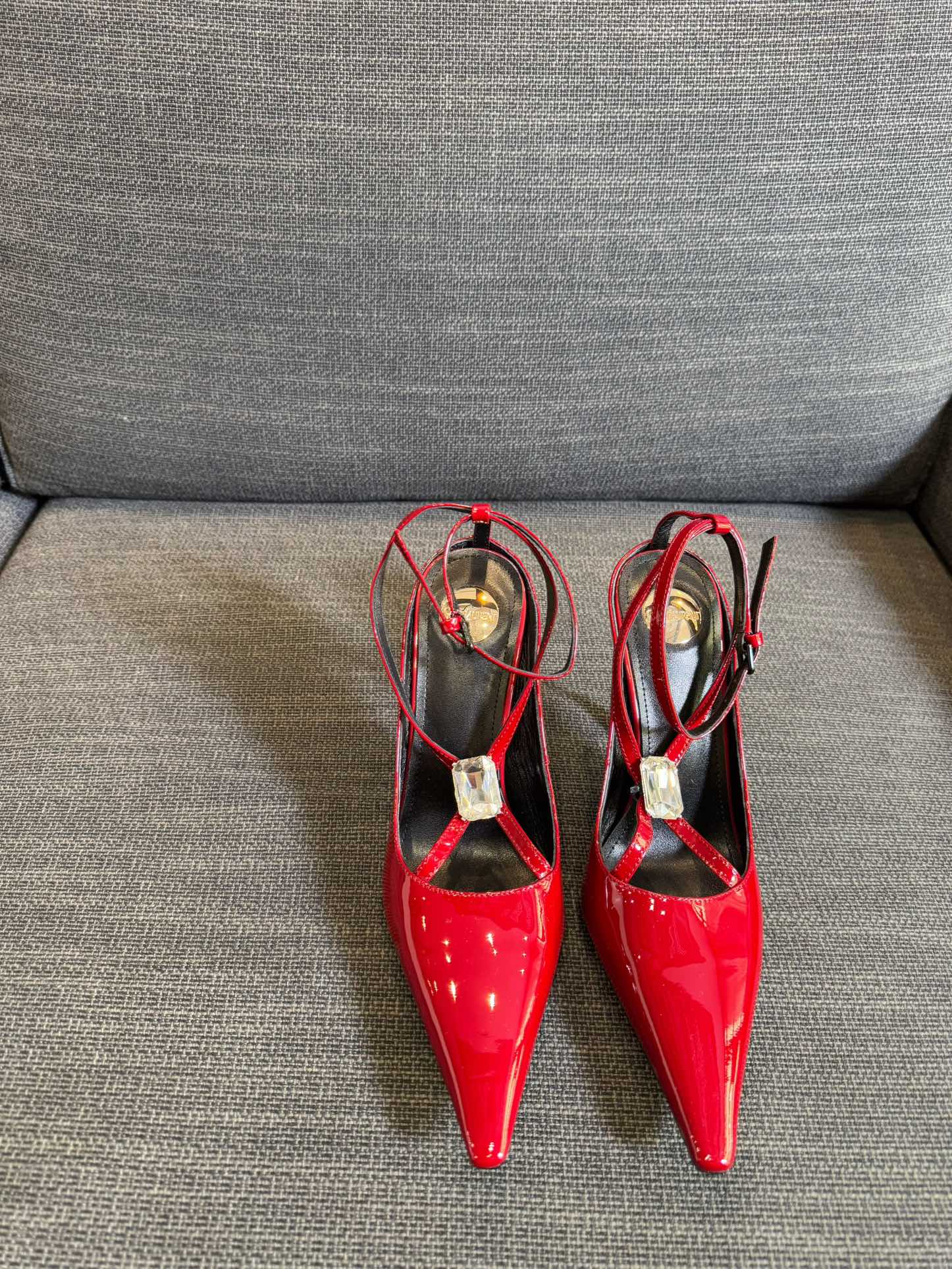 GOLD CHAIN ATTACHED HIGH SLINGBACK IN RED GLOSSY CALFSKIN