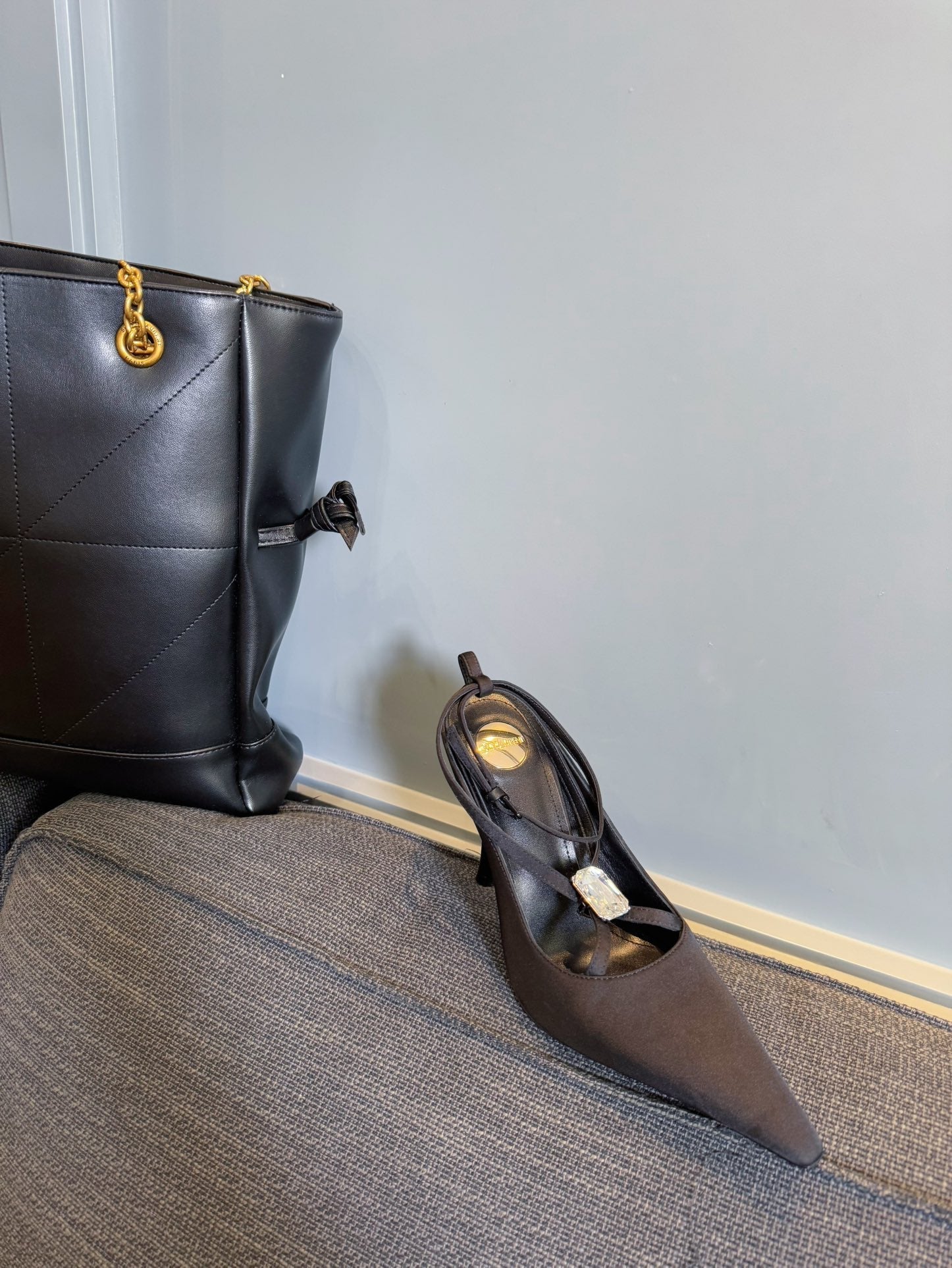 HIGH PUMPS IN BLACK SILK ATTACHED GOLD CHAIN