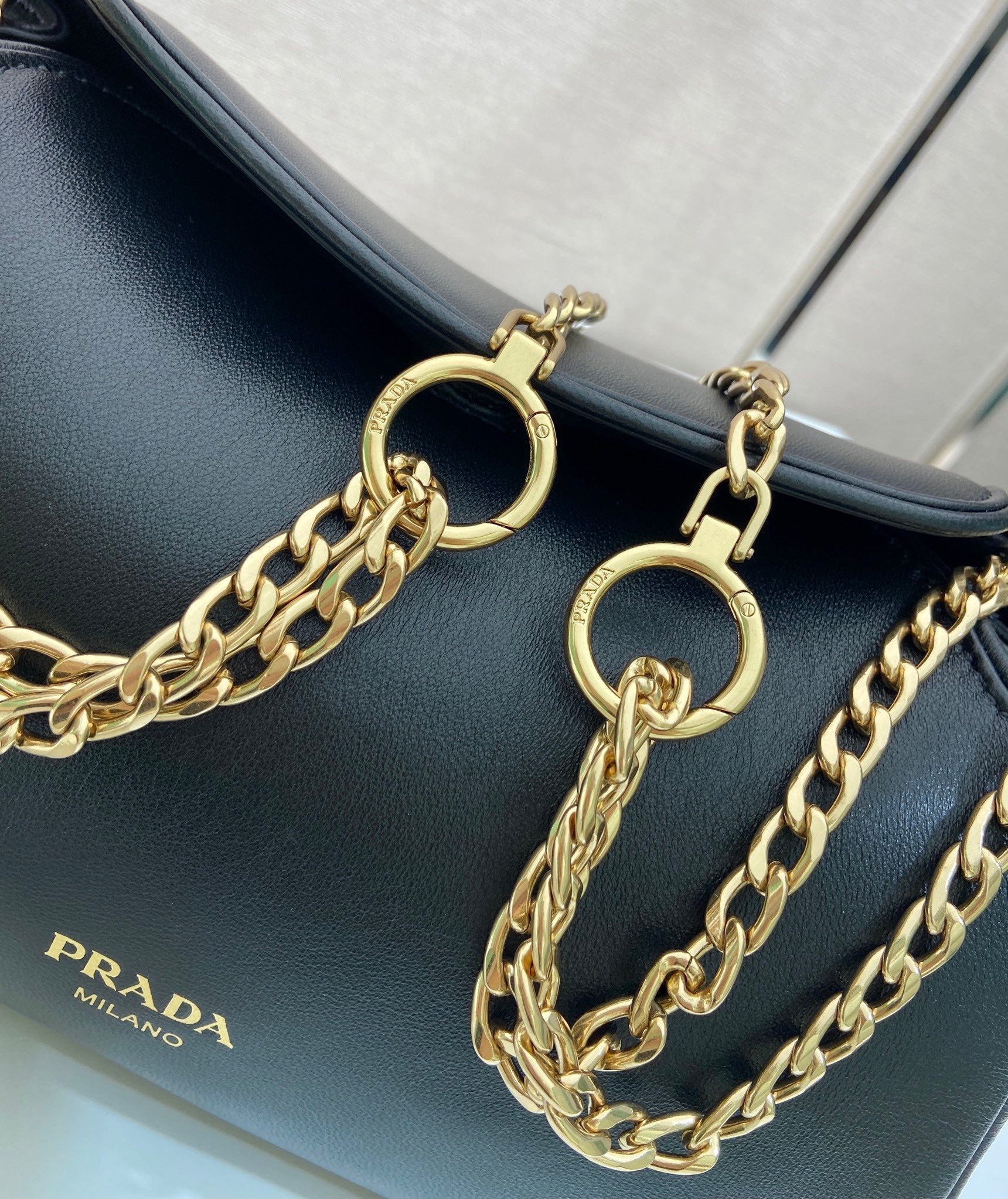 PRA bucket bag iron chain belt black leather 341179
