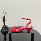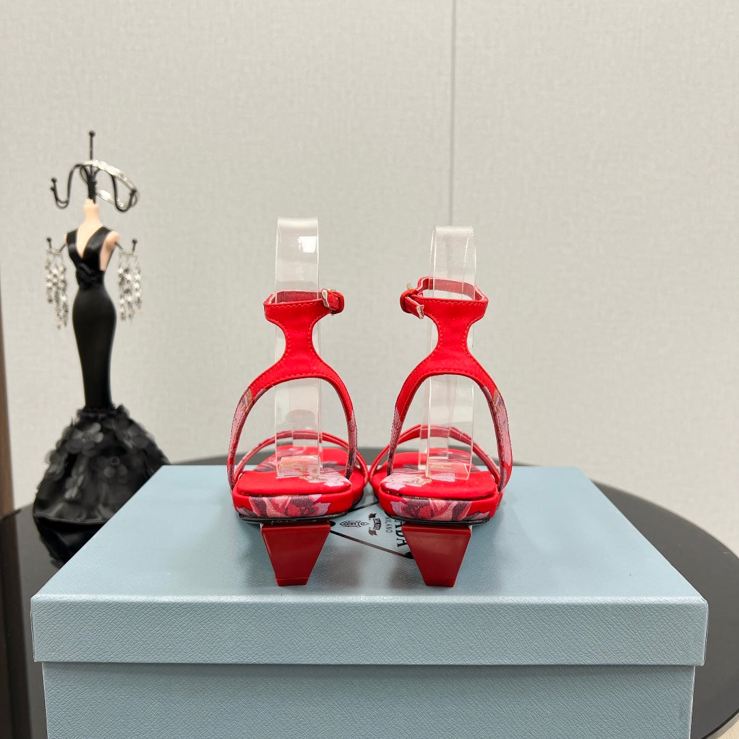 PRA TRIANGLE HEEL FLOWER MOTIF SATIN SANDALS RED