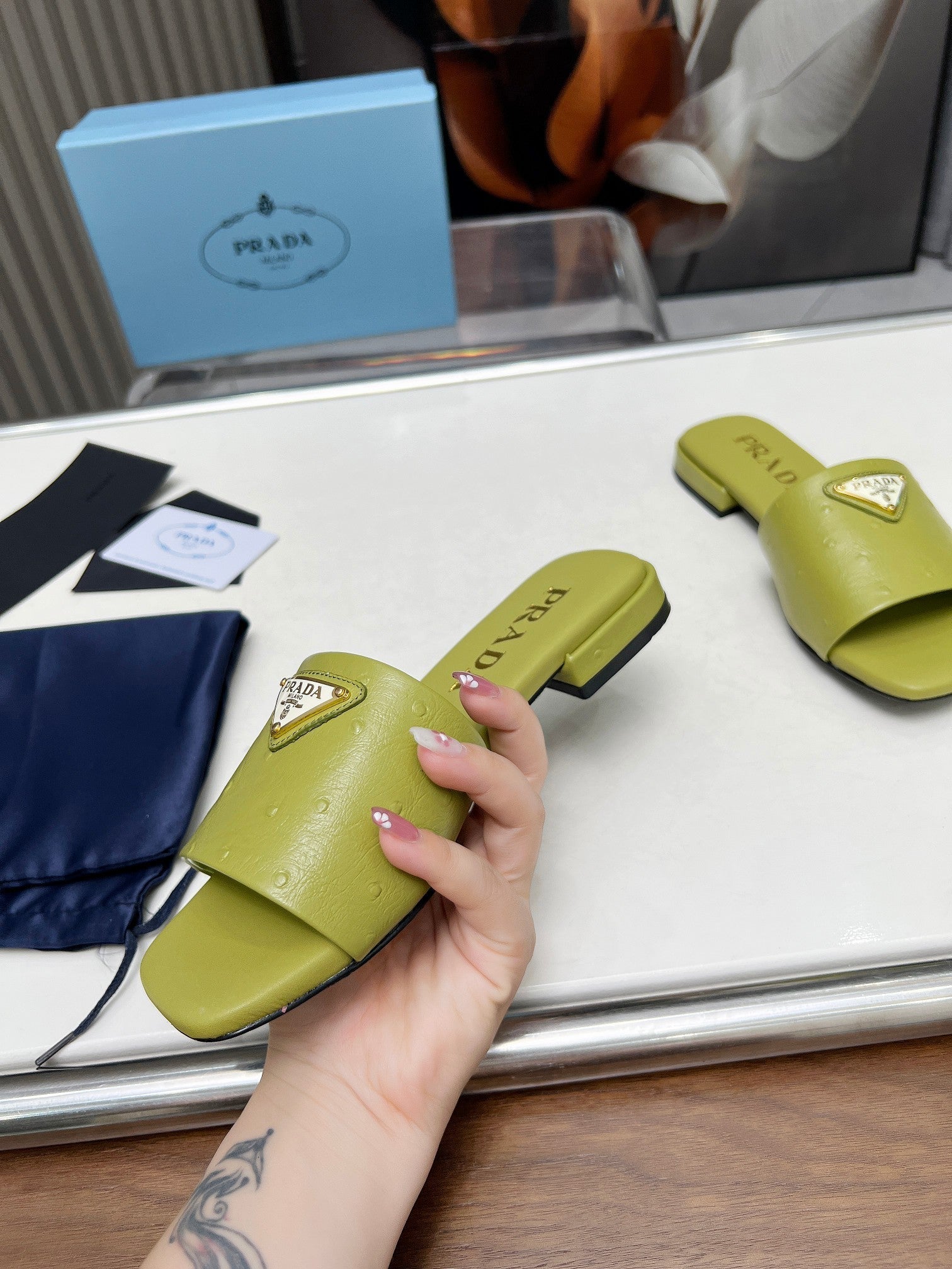 PRA SAFFIANO PATENT SLIDES OSTRICH MOTIF PEAR CALFSKIN