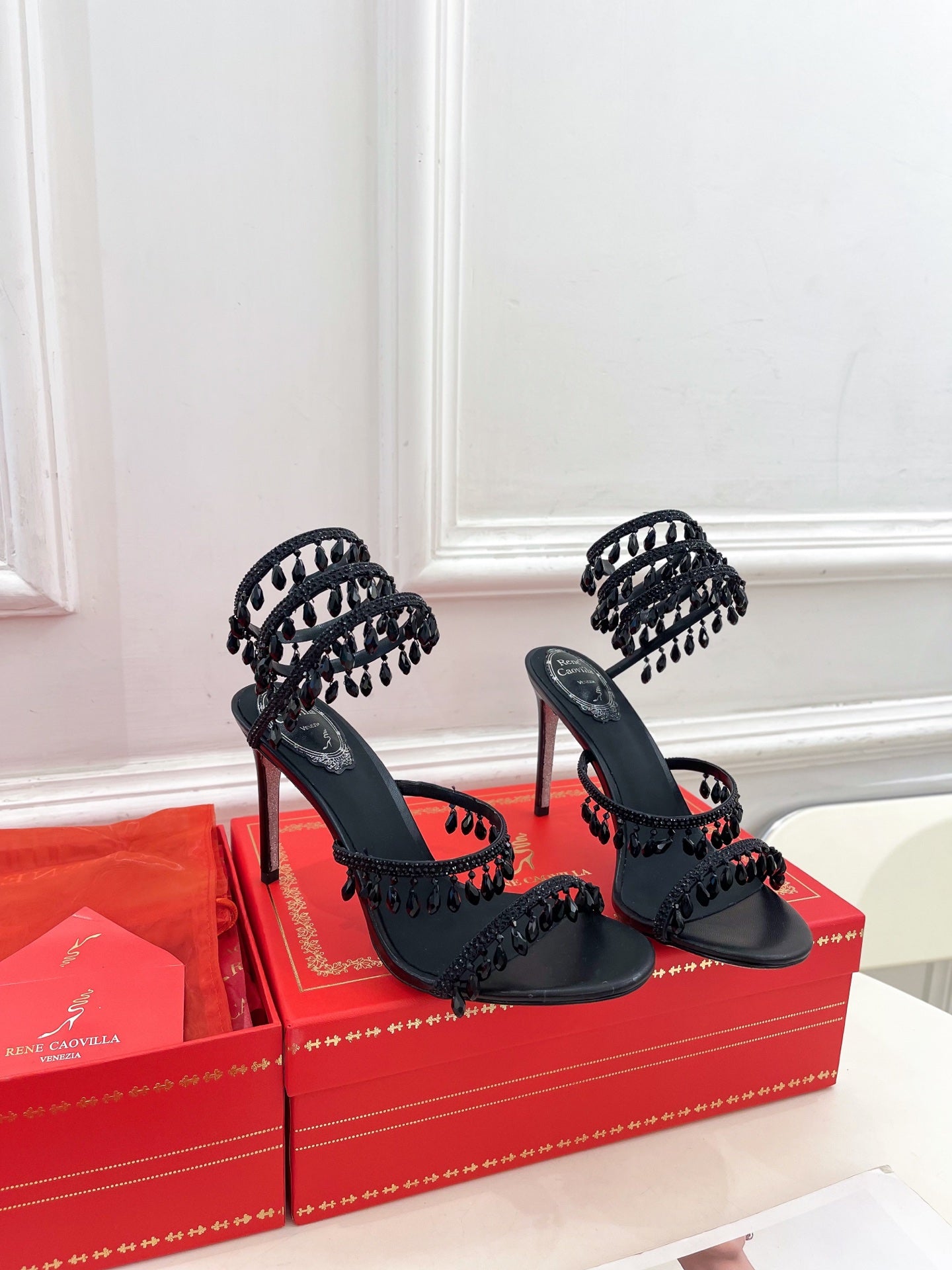 RC 25 Crystal Tassel High-Heeled Sandals Black Silk Crystal Diamond 253539