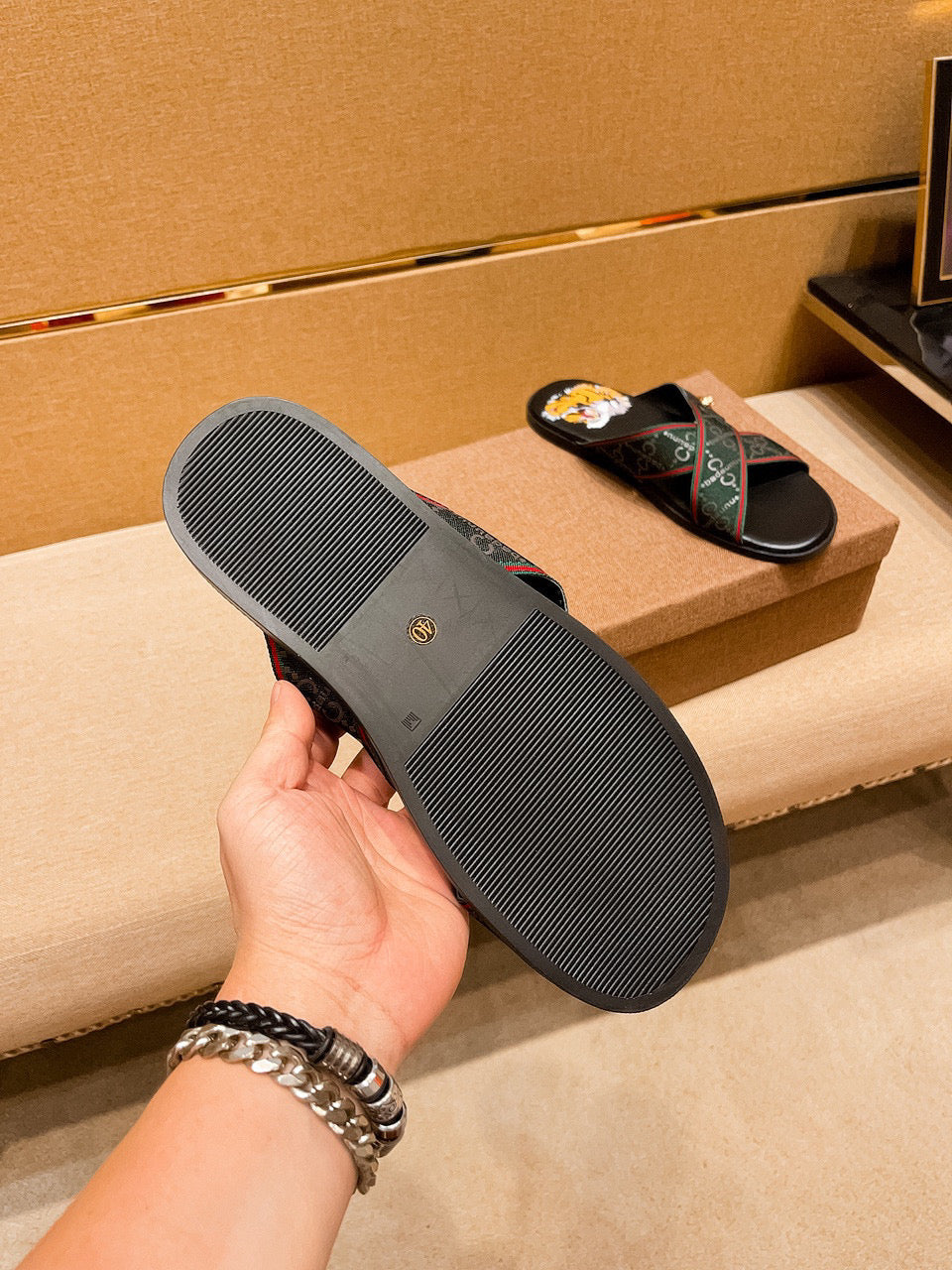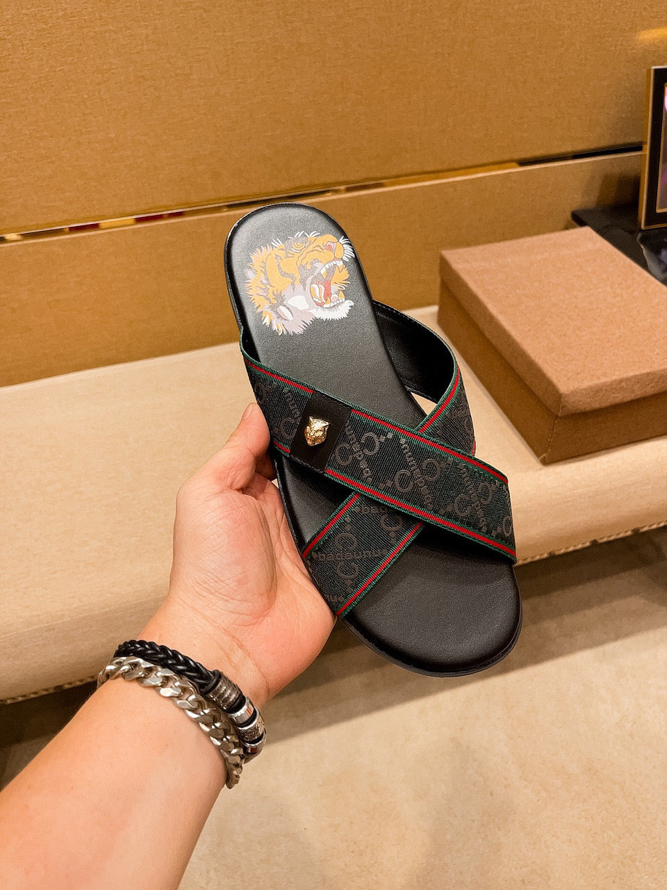 GG Men's Sandals Slide Green Black Leather