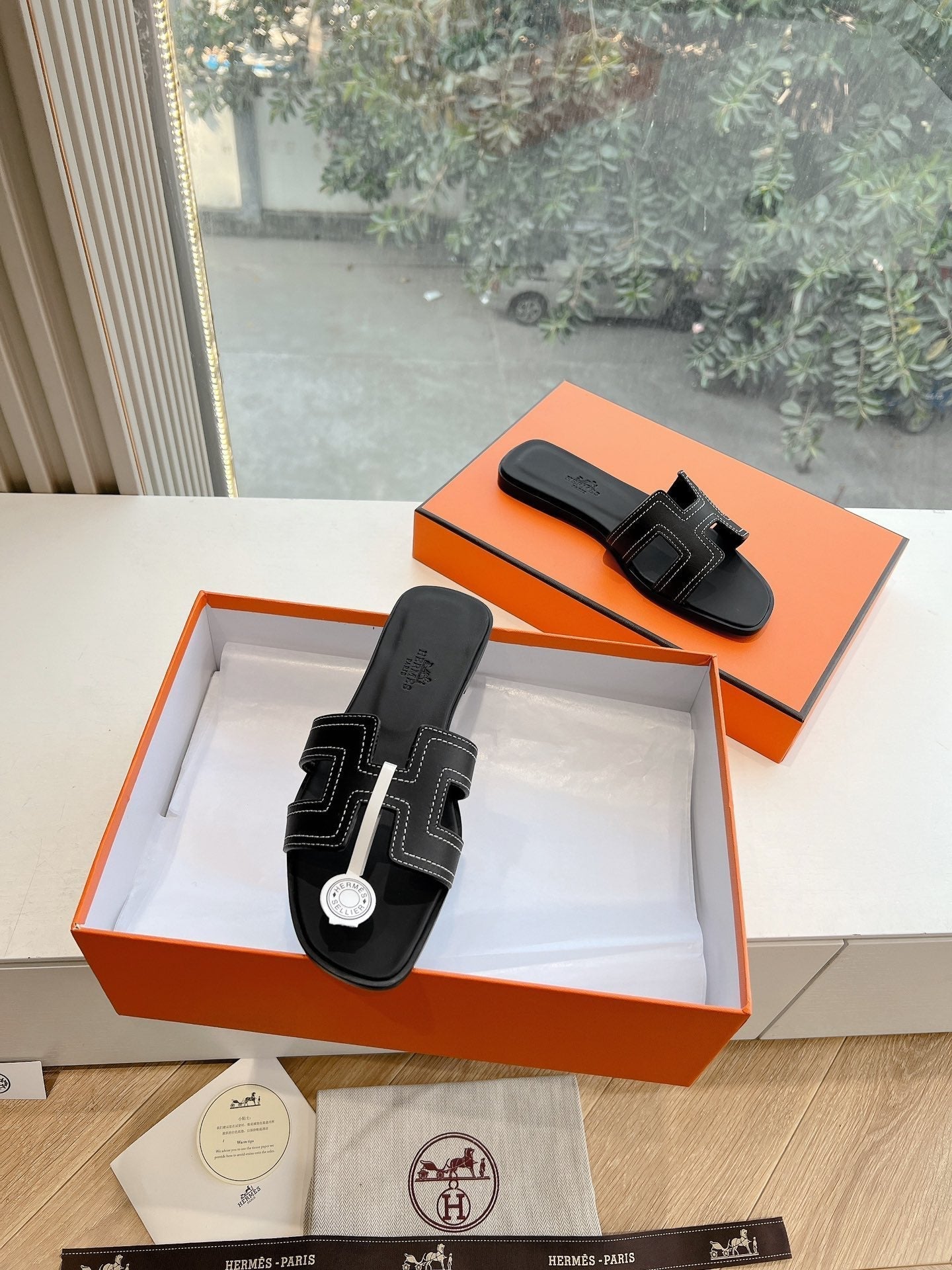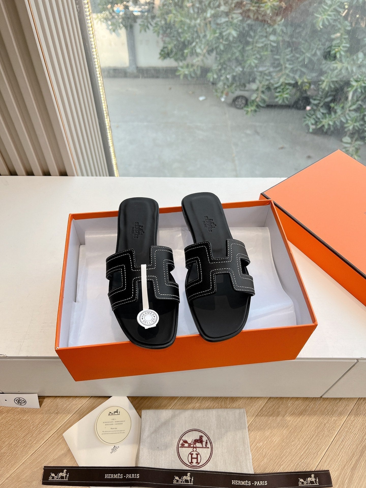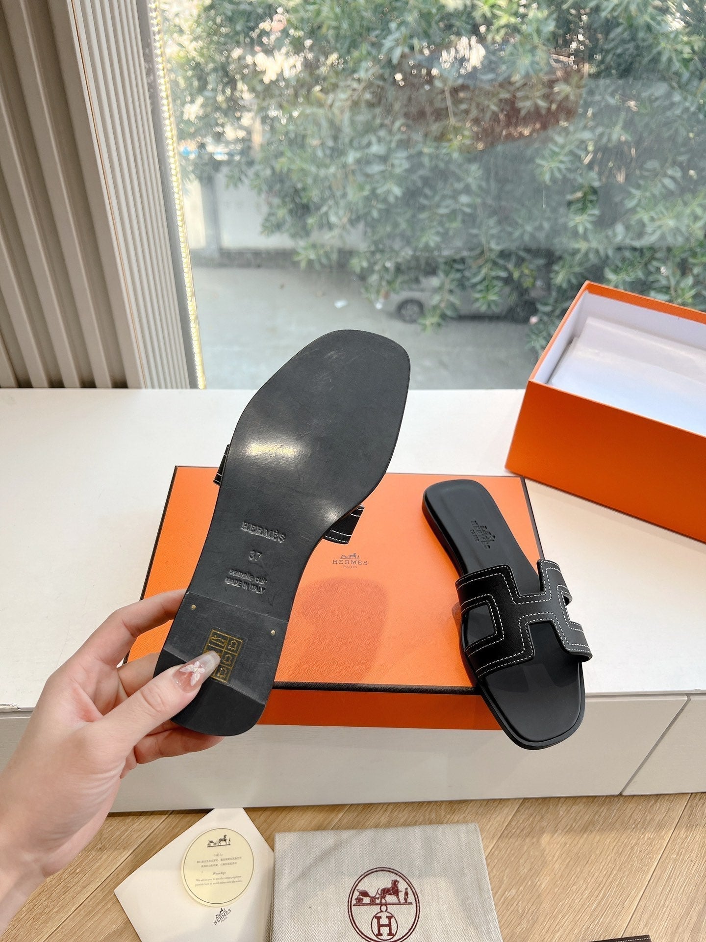 HM 25 Oran Sandal Black Calfskin White Thread Embroidery