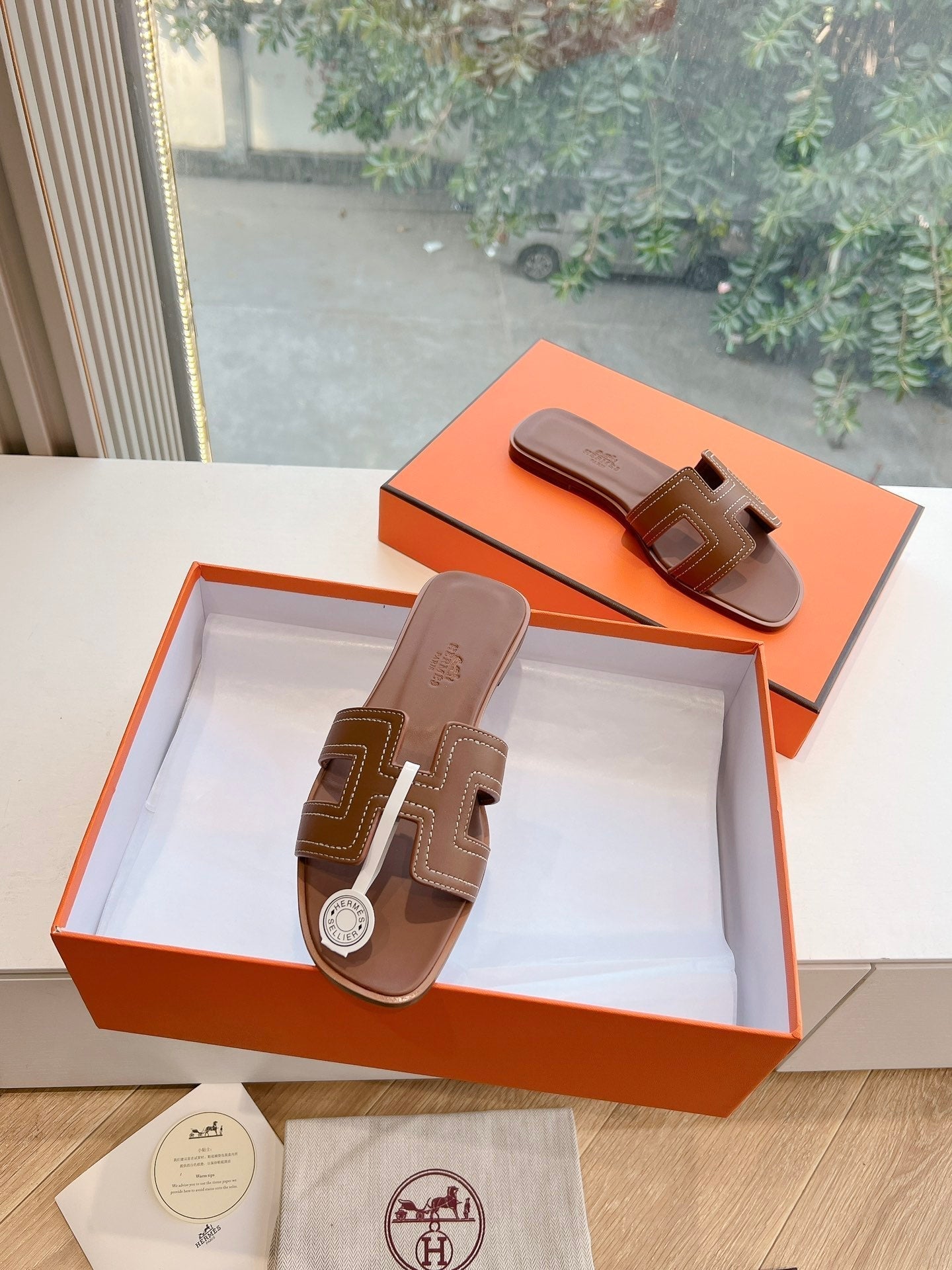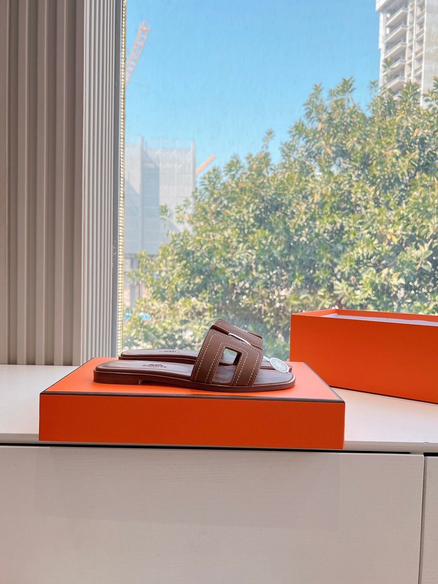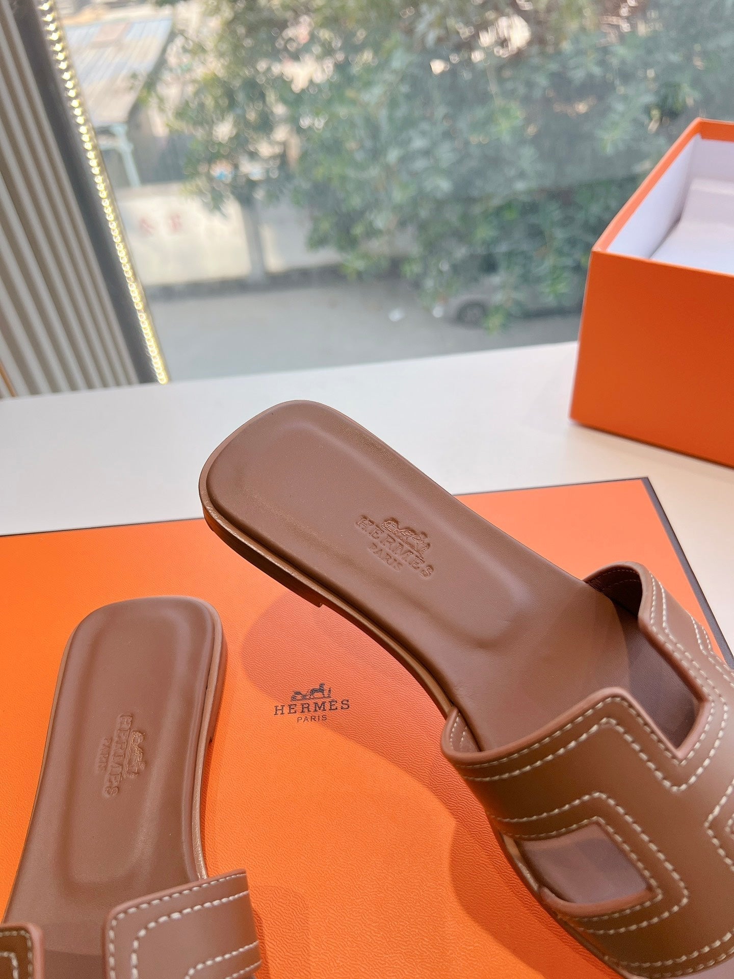 HM 25 Oran Sandal Brown Calfskin White Thread Embroidery
