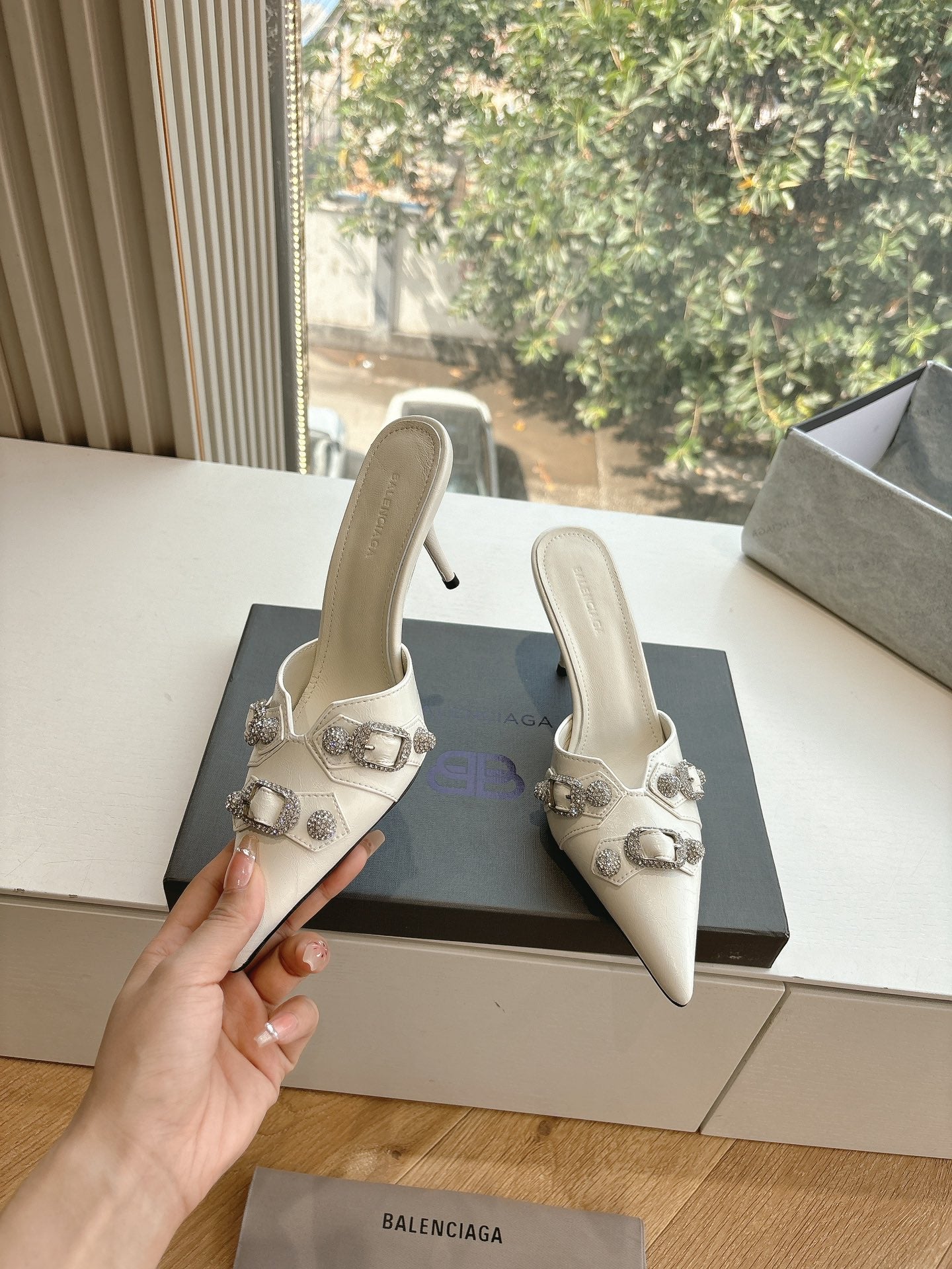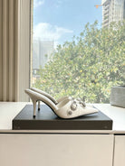 CRYSTAL BUCKLE WHITE CALFSKIN HEELED MULES