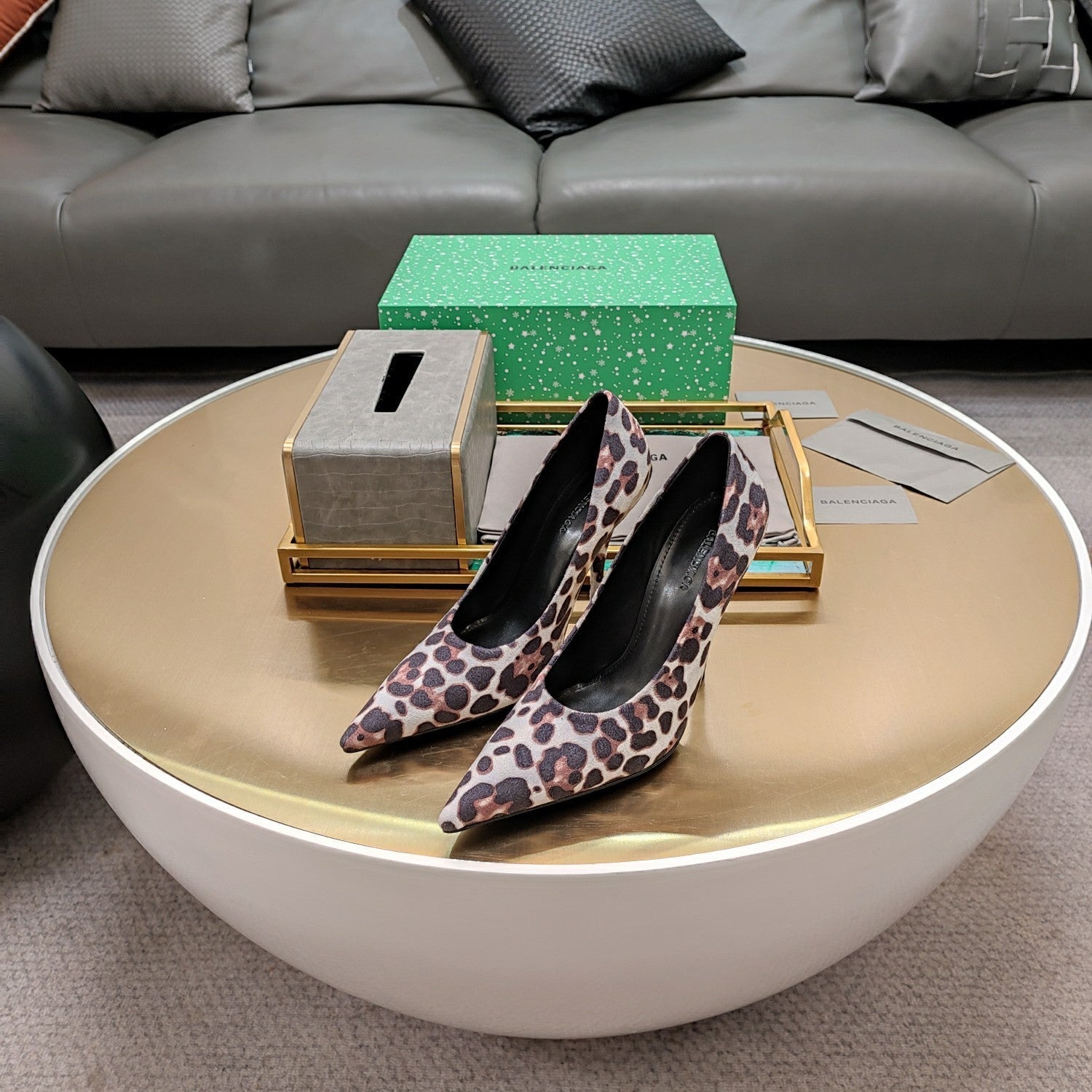 HIGH PUMPS IN LIGHT GRAY LEOPARD PRINT SUEDE