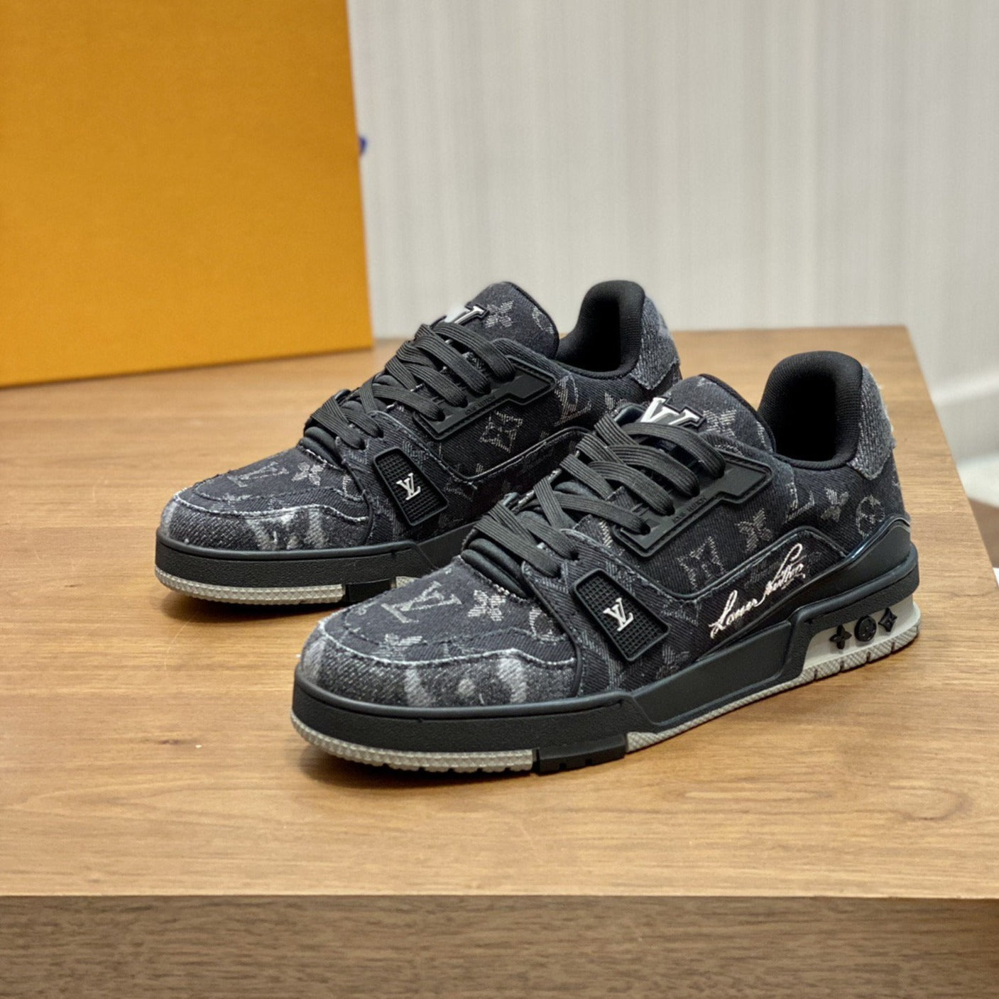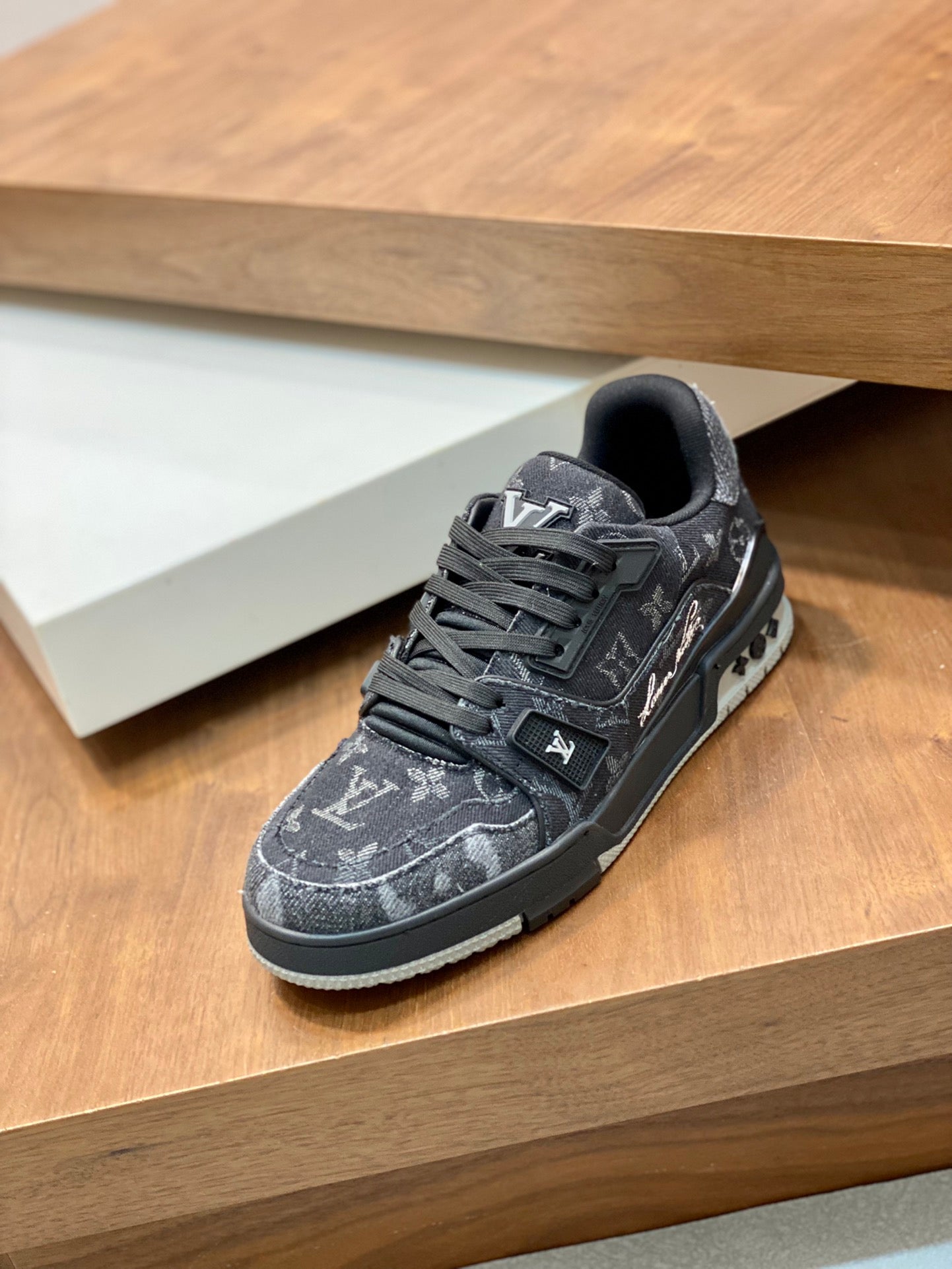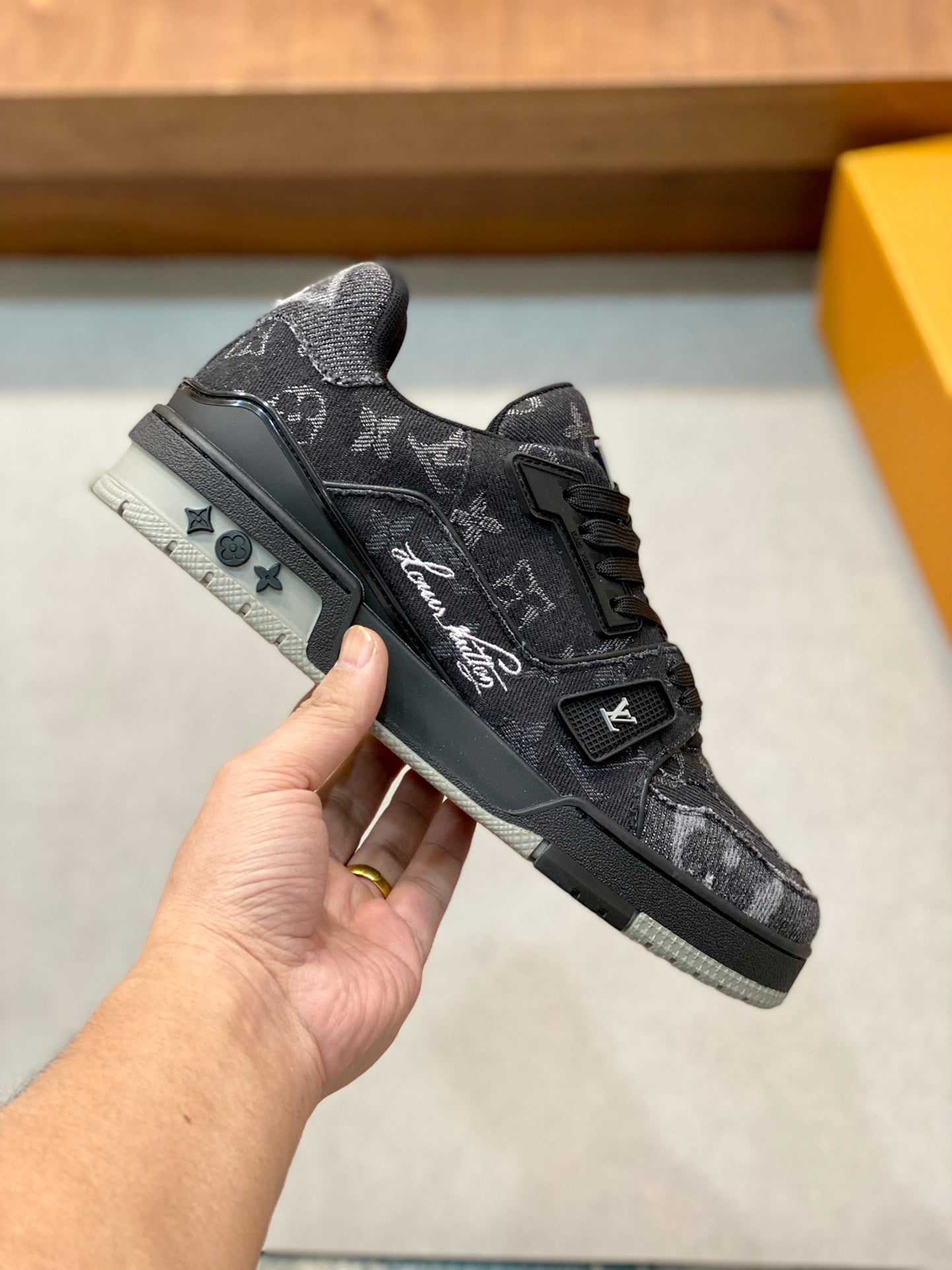 • Upper: "Bold colors are used to highlight the exquisite design, inspired by classic basketball shoes. The LV logo is hand-embroidered on one side."