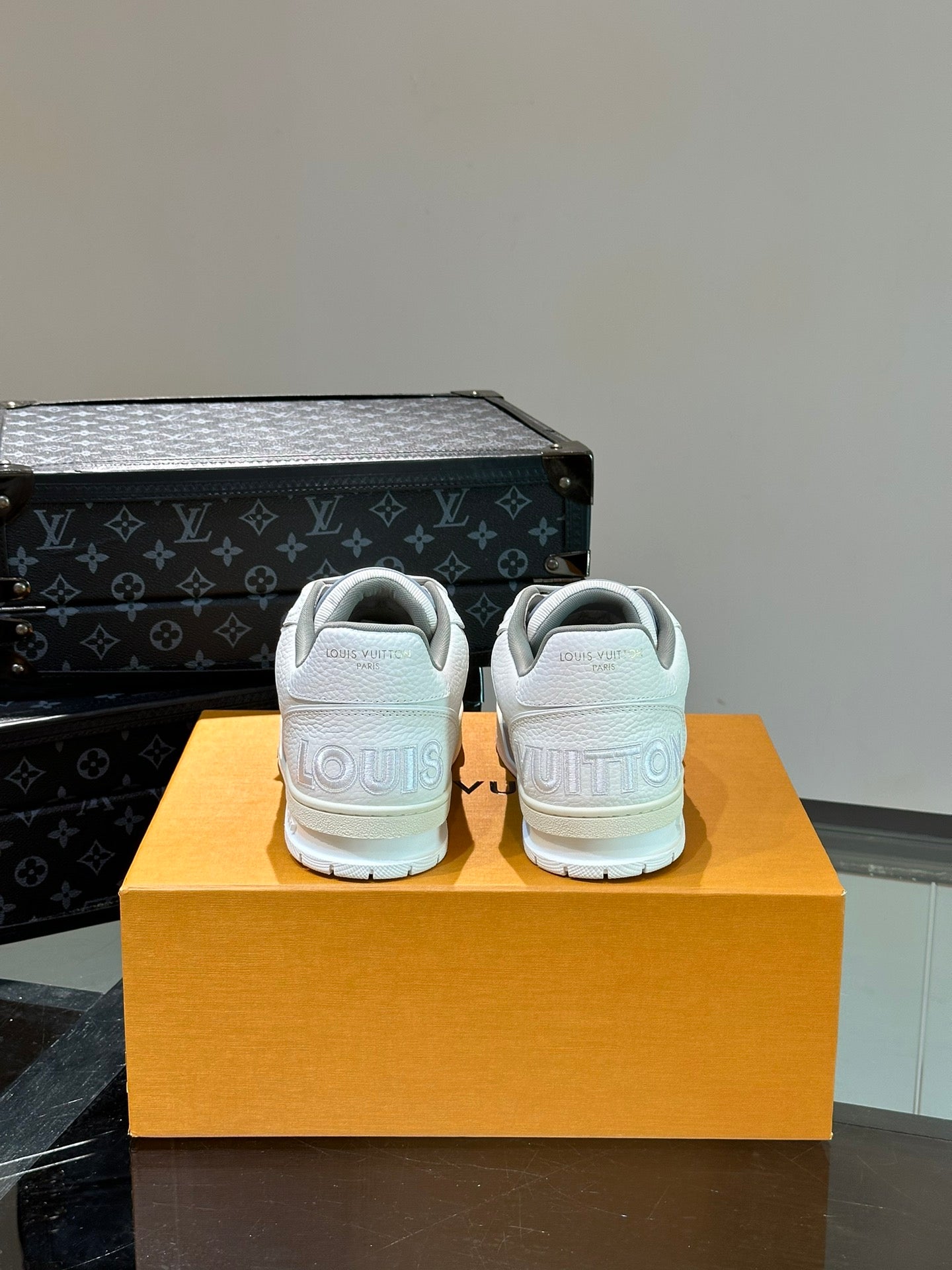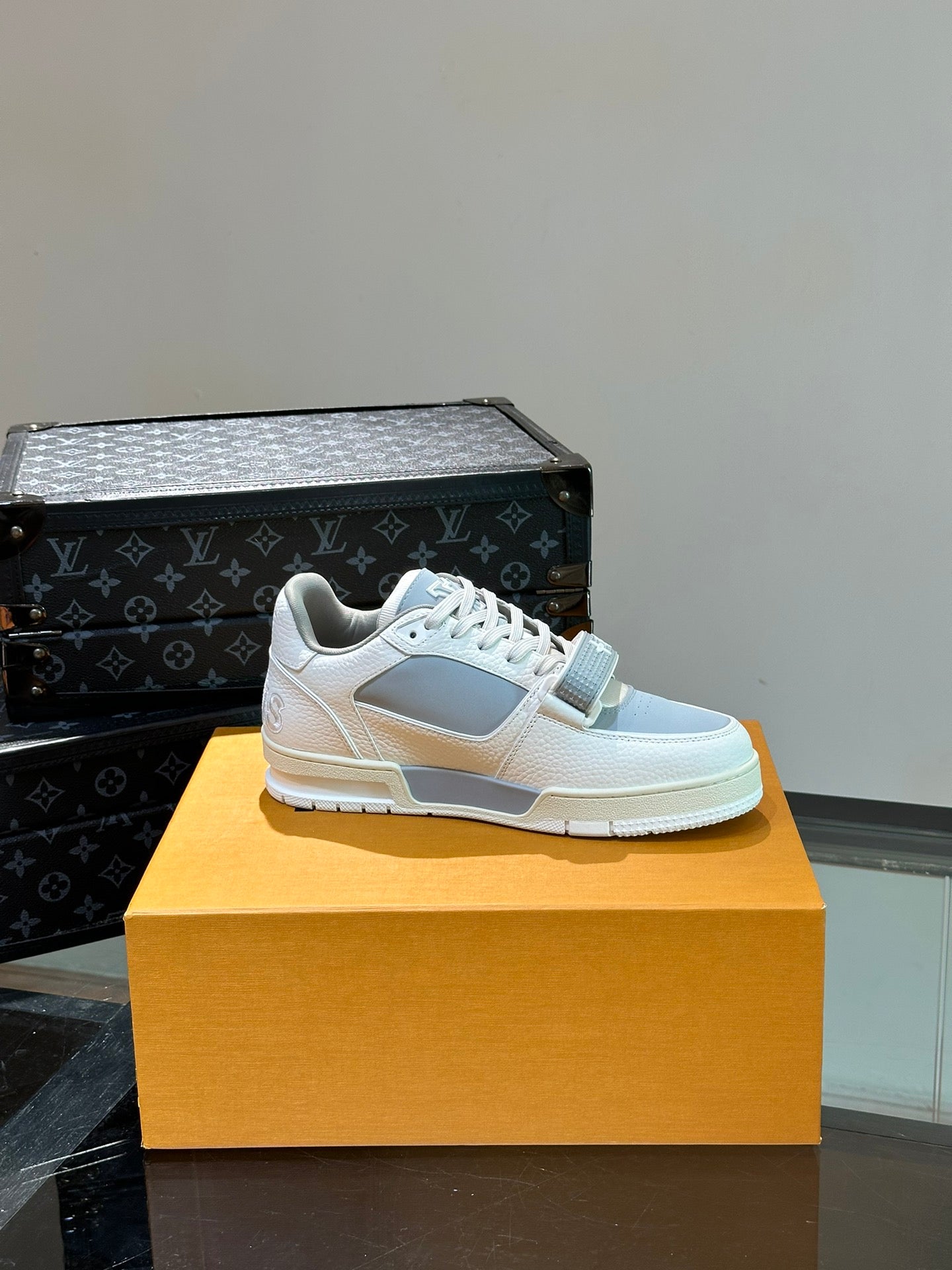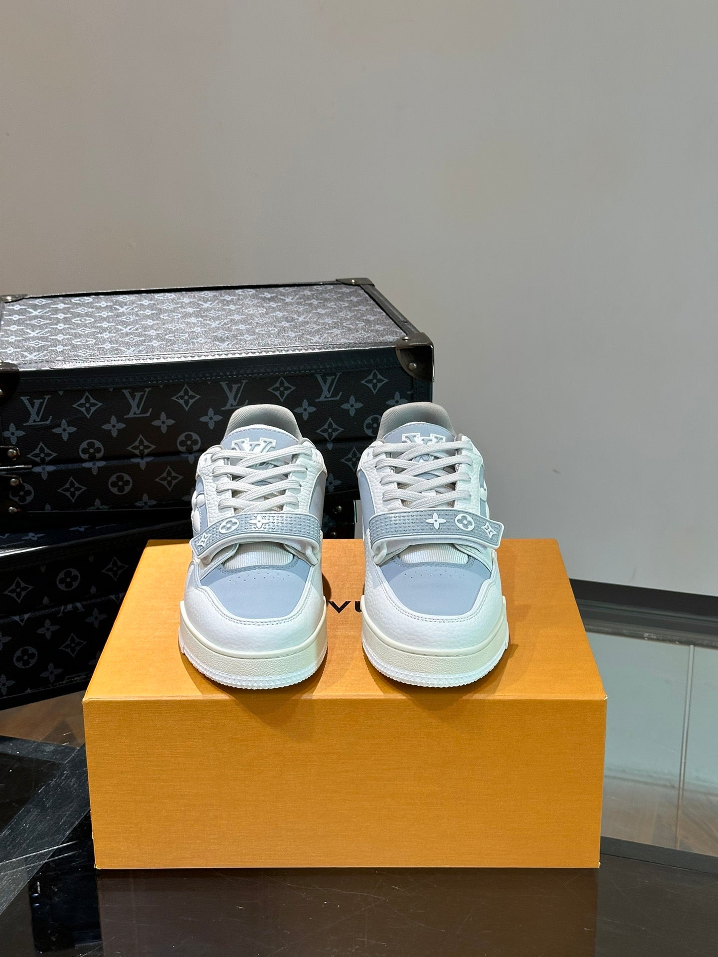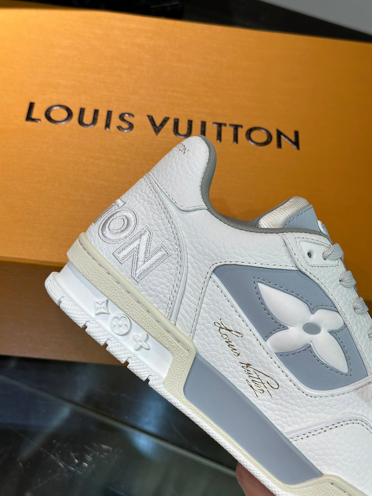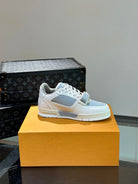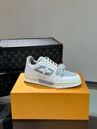 LV TRAINER SNEAKERS IN WHITE CALFSKIN AND LIGHT BLUE SUEDE