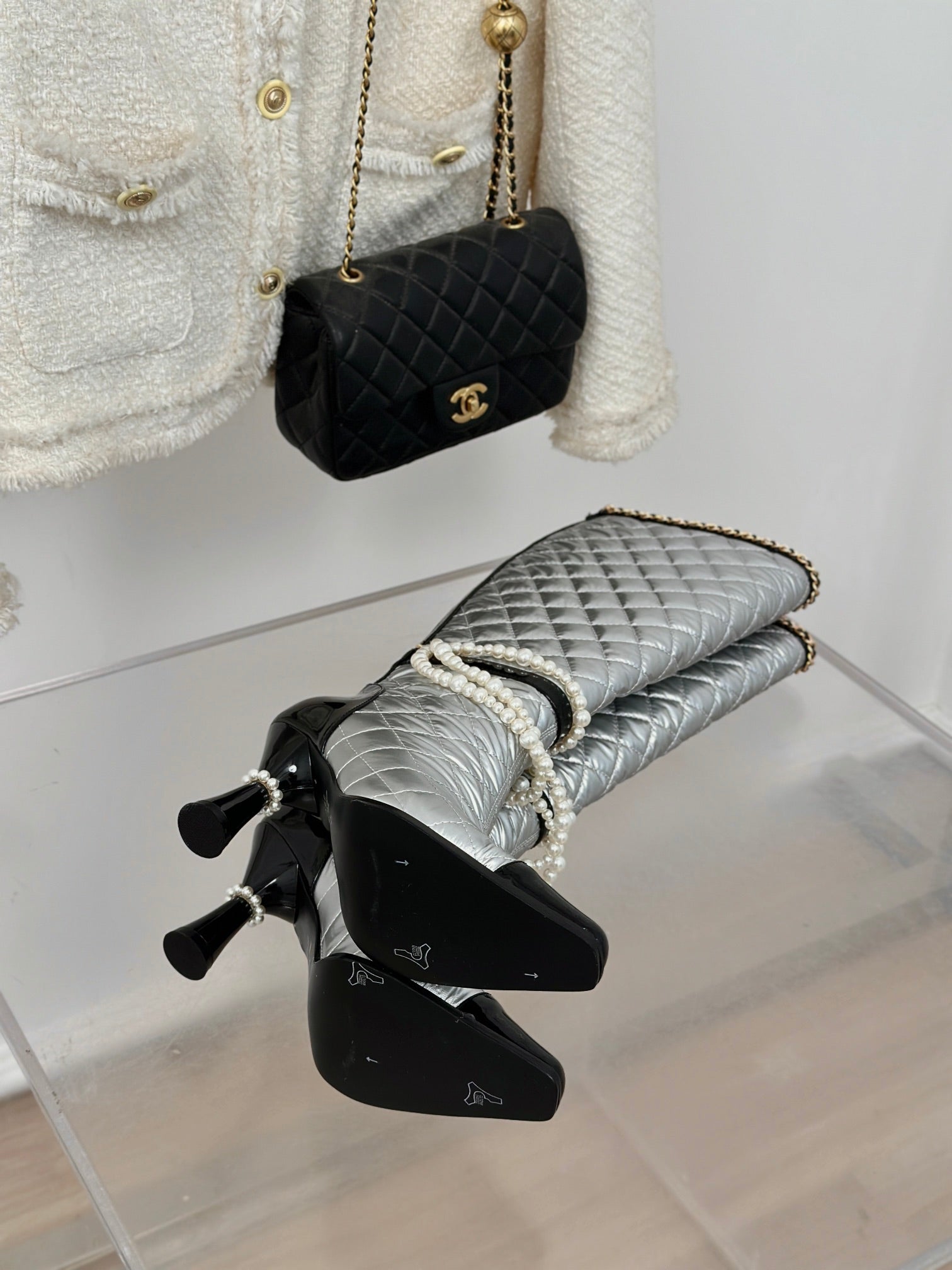 CC High Heels 80mm Grey Black Bow Quilted Calfskin