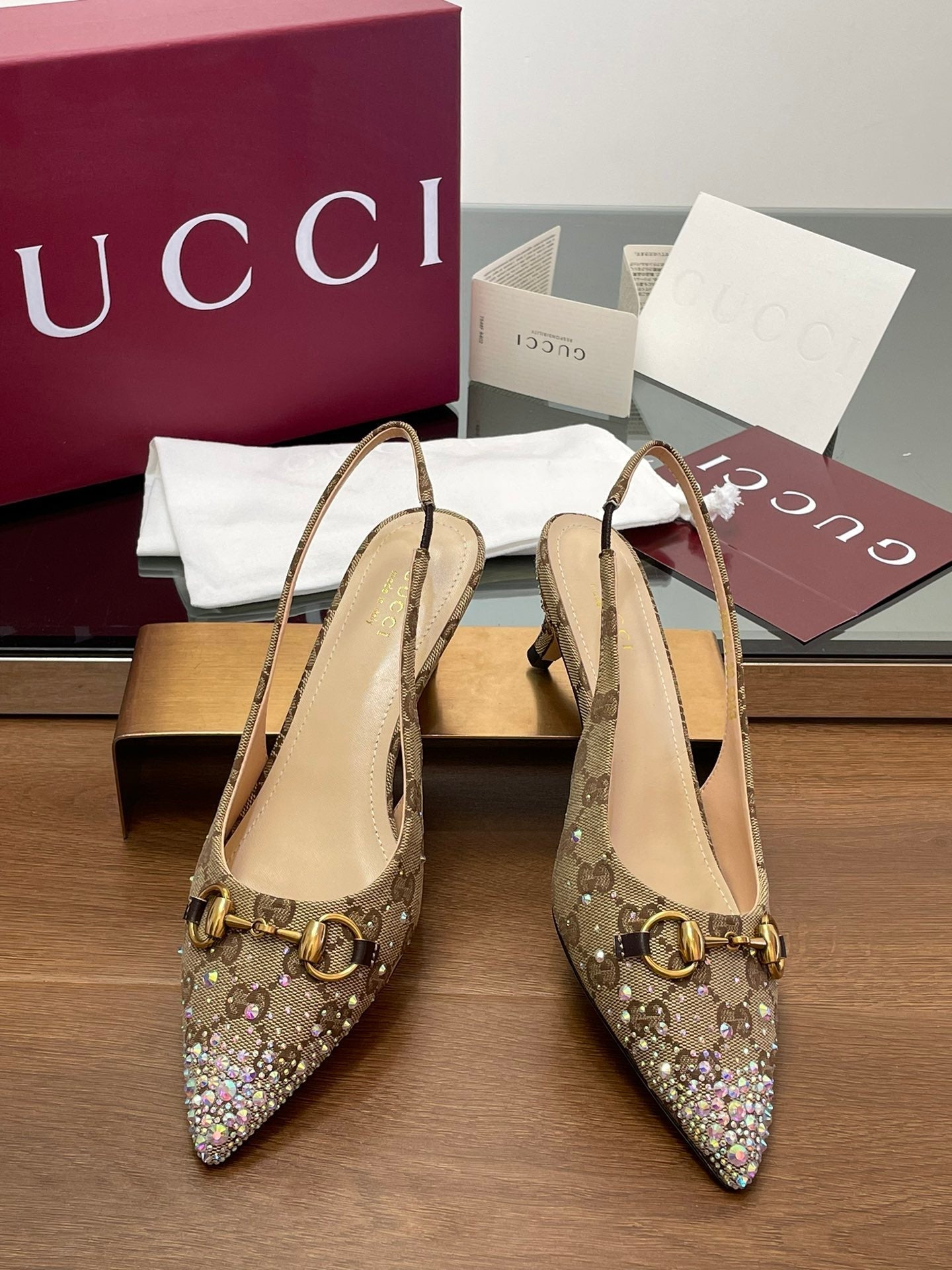 GG Horsebit Slingback 85MM Beige Ebony Monogram Canvas Point Toe Crystal-Embellished