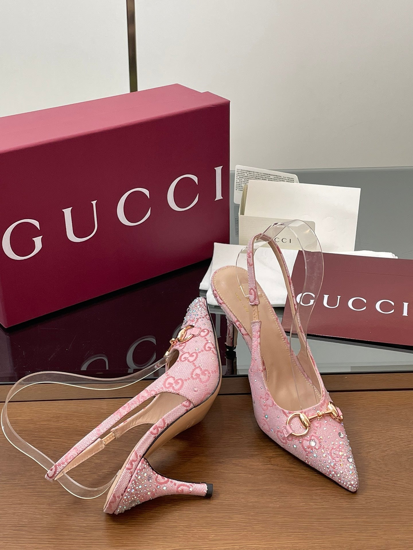 GG Horsebit Slingback 45MM Pink Ebony Monogram Canvas Point Toe Crystal-Embellished
