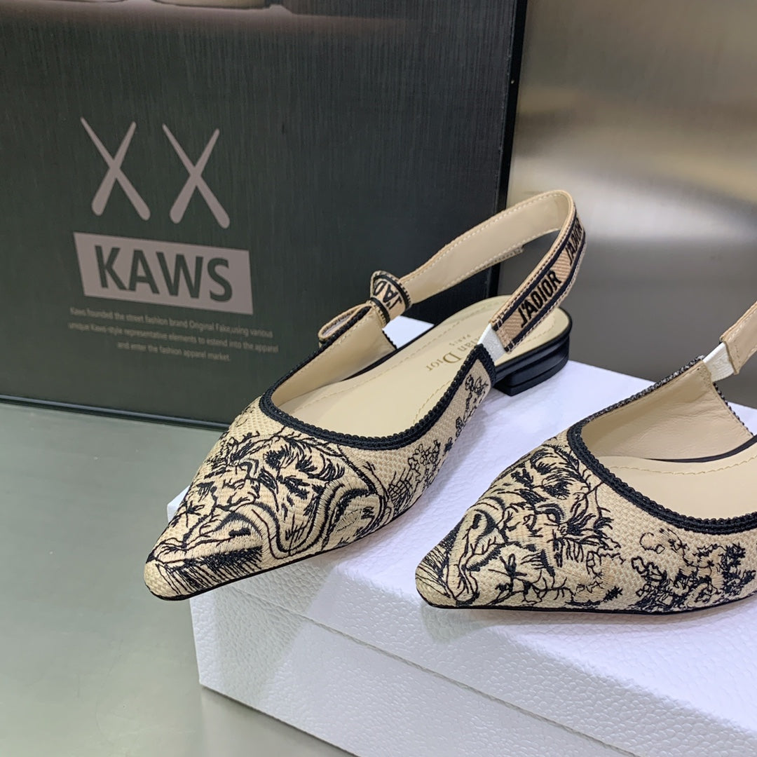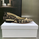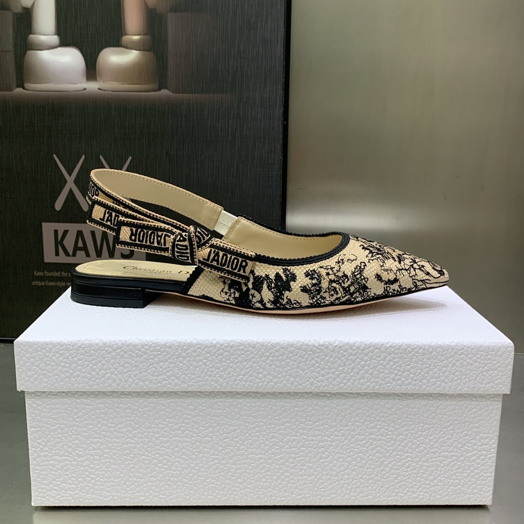 JAdior Slingback Flat Black Embroidered Cotton with Gold-Tone Metallic Thread