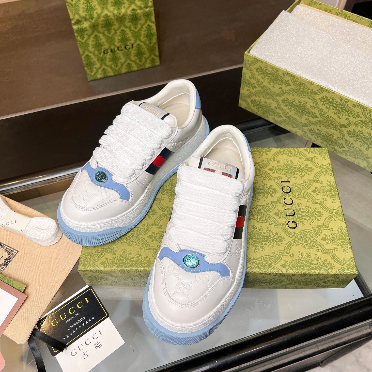 GG Men's Screener Sneaker White Blue Canvas Sheepskin 523602