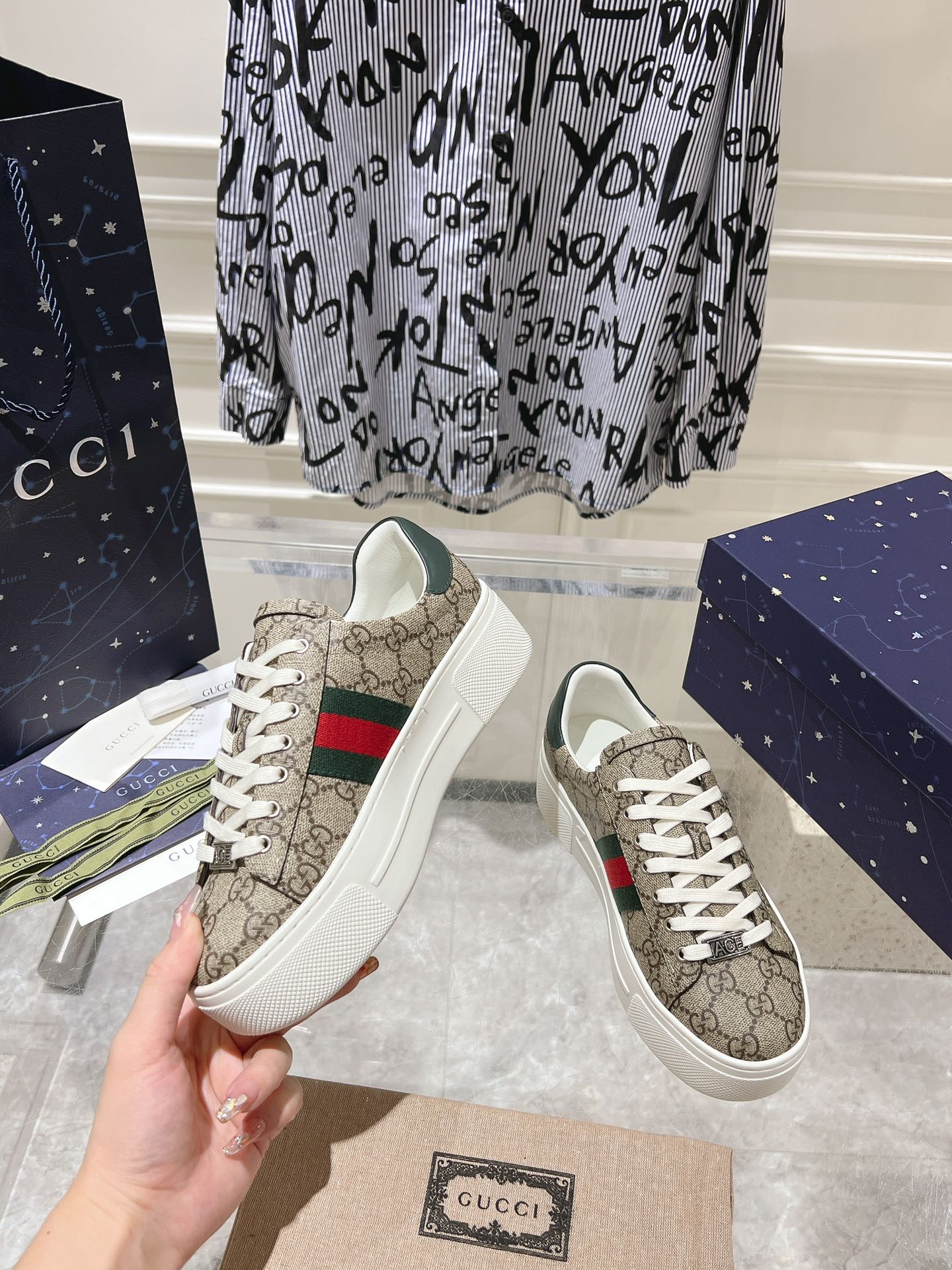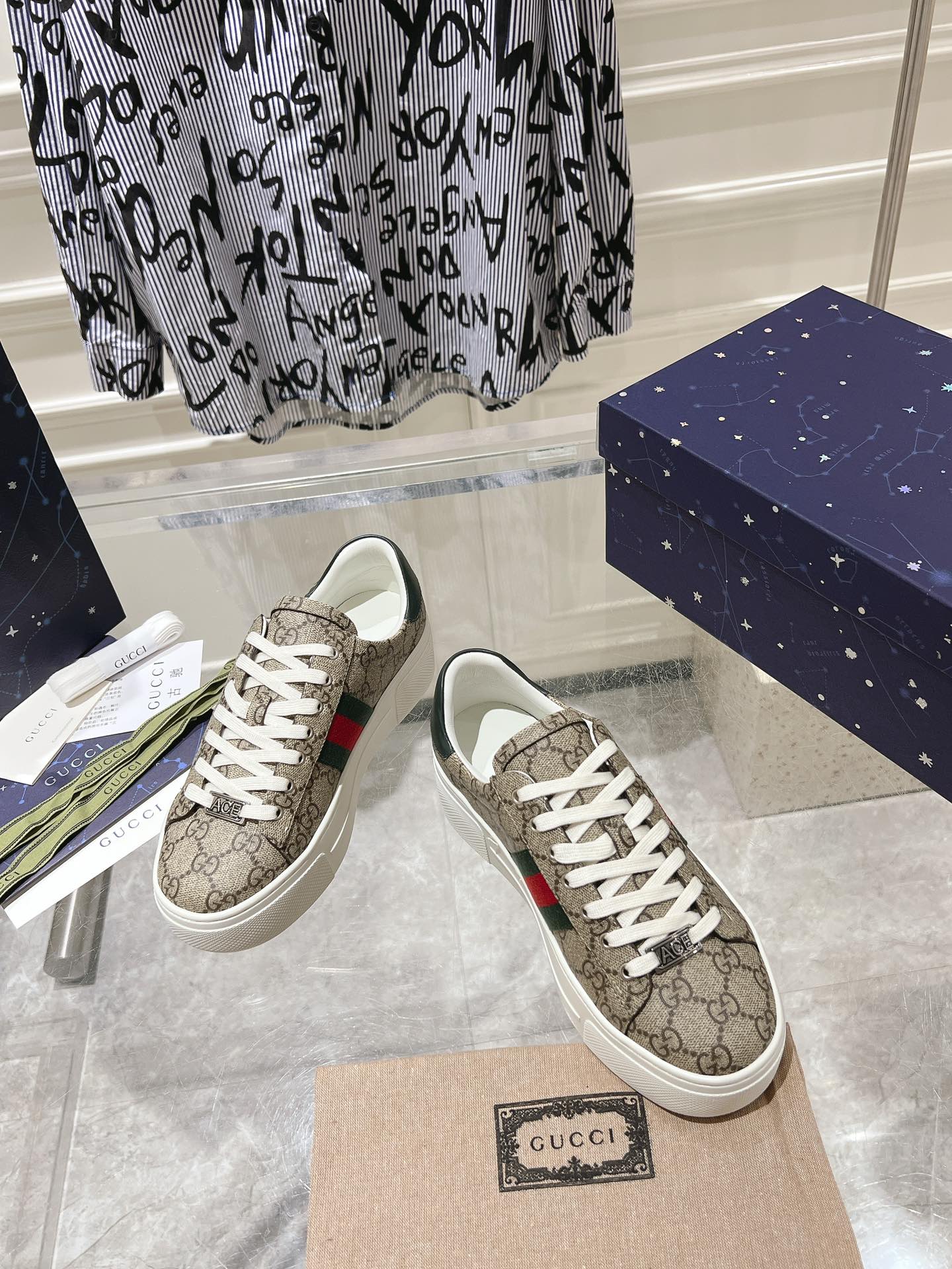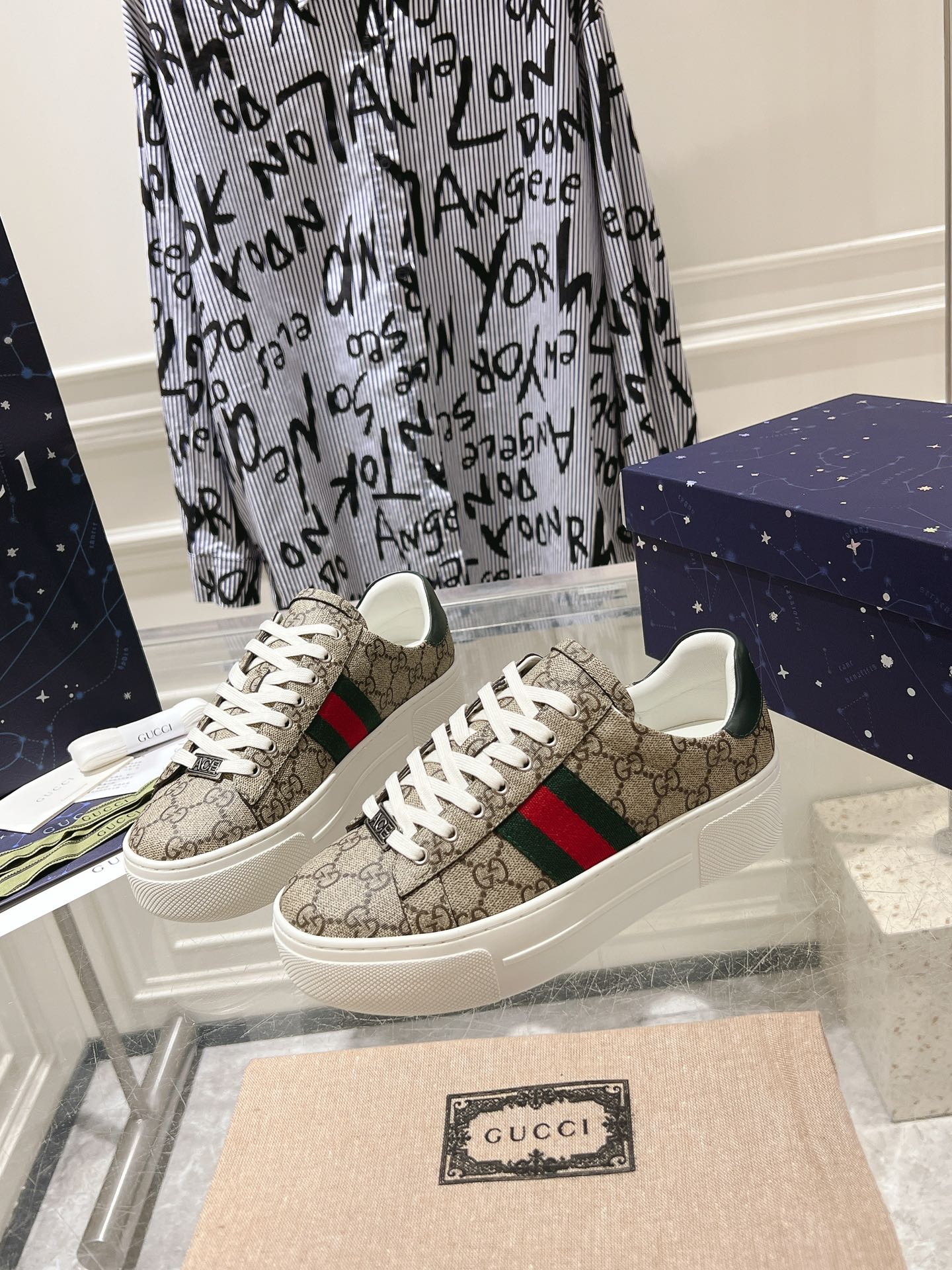 GG ACE GG SUPREME TRAINER BLACK CALFSKIN WITH PATTERNS