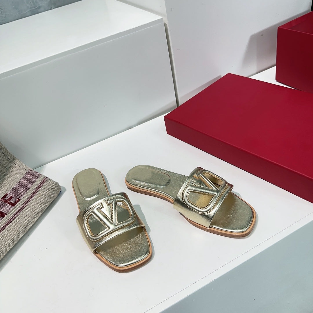Vlogo Cut-Out Gold Calfskin Slide Sandal
