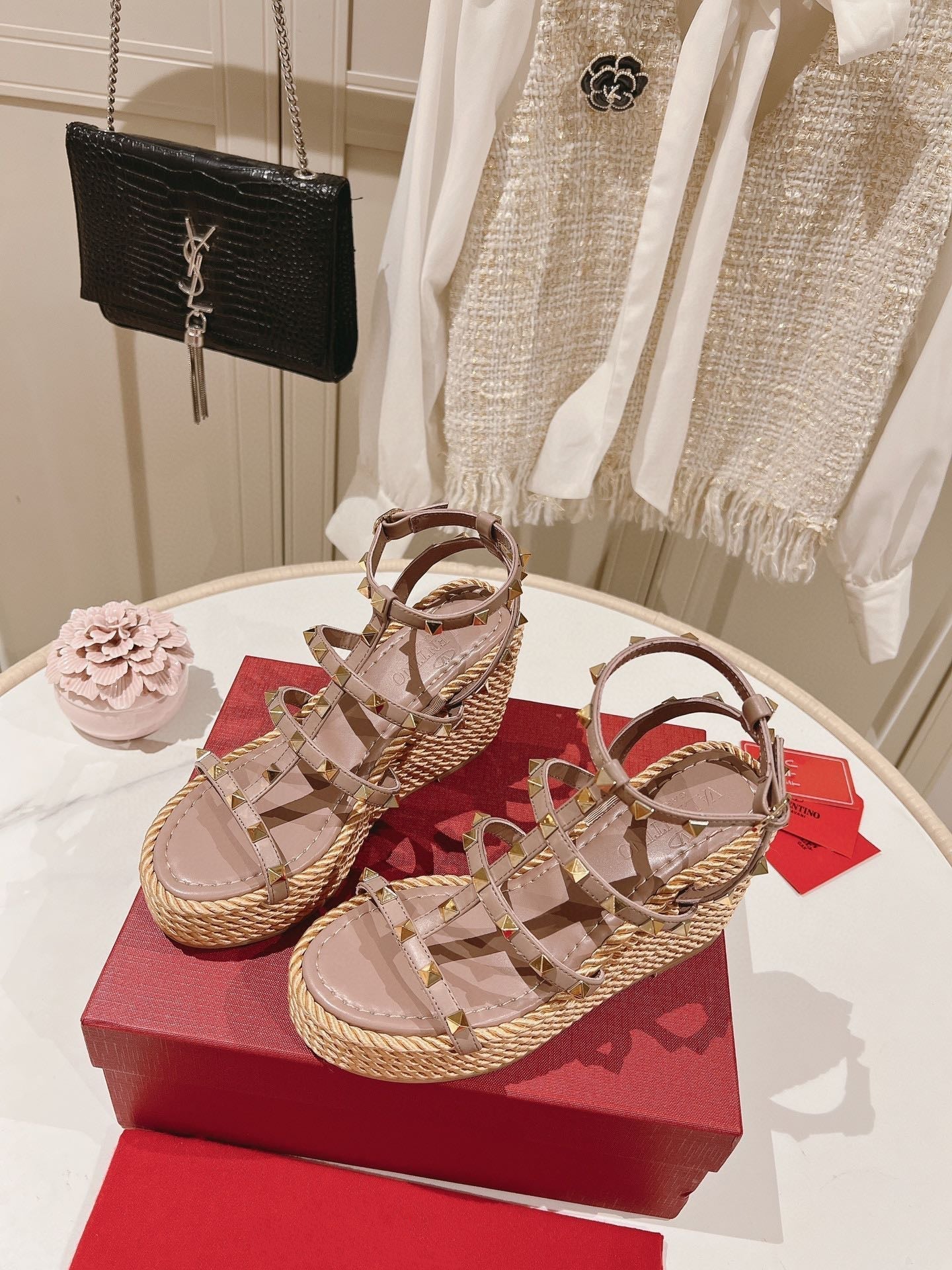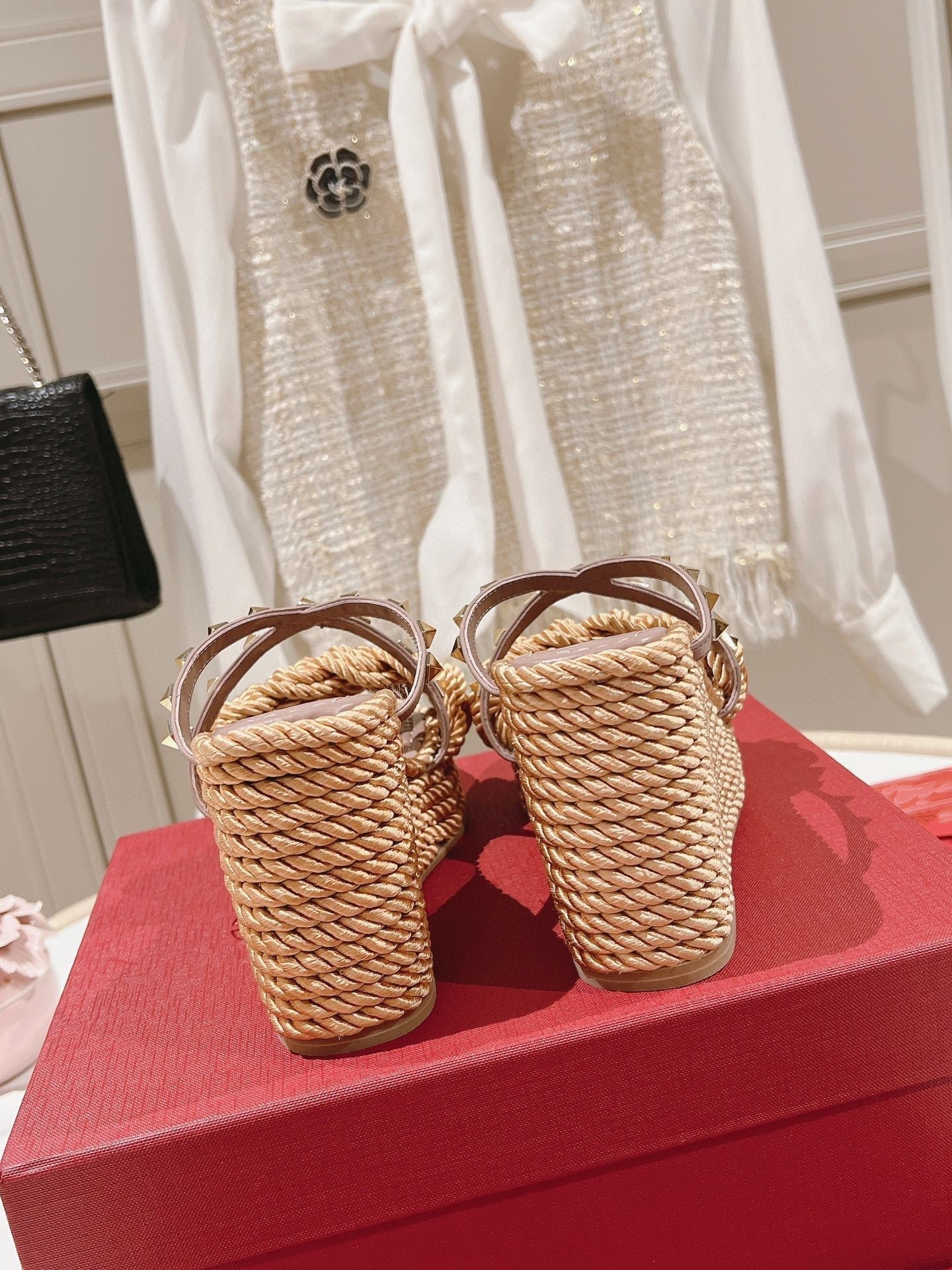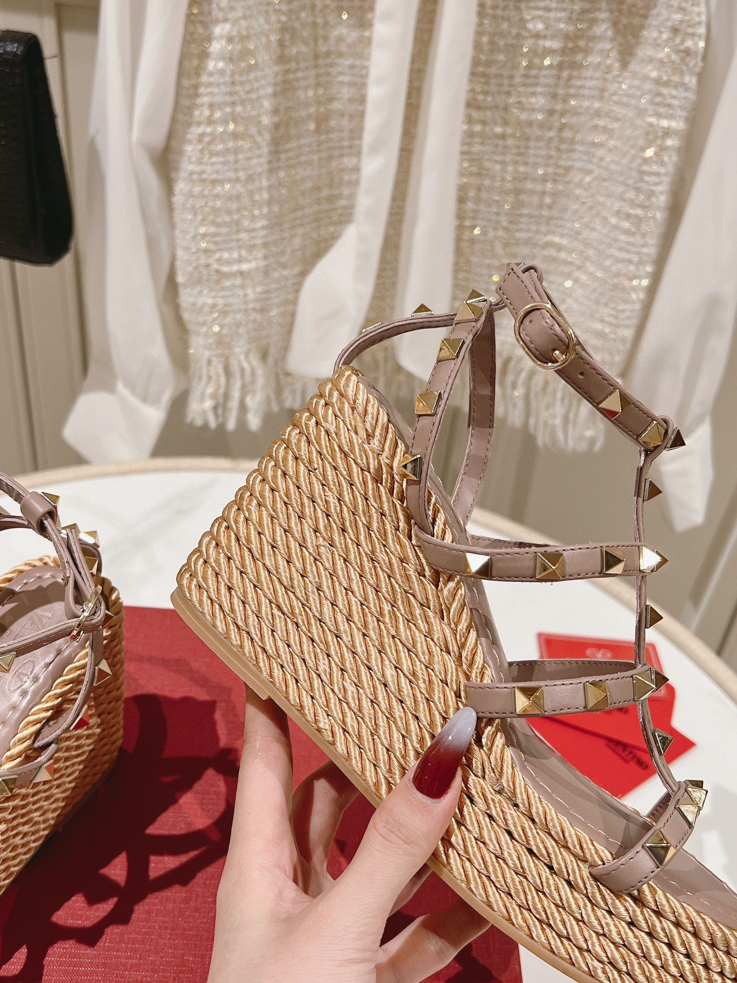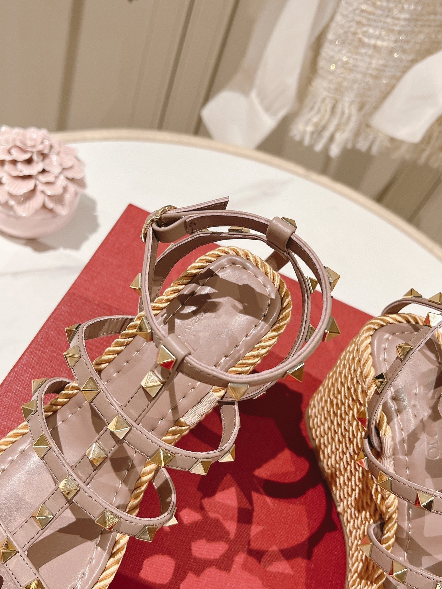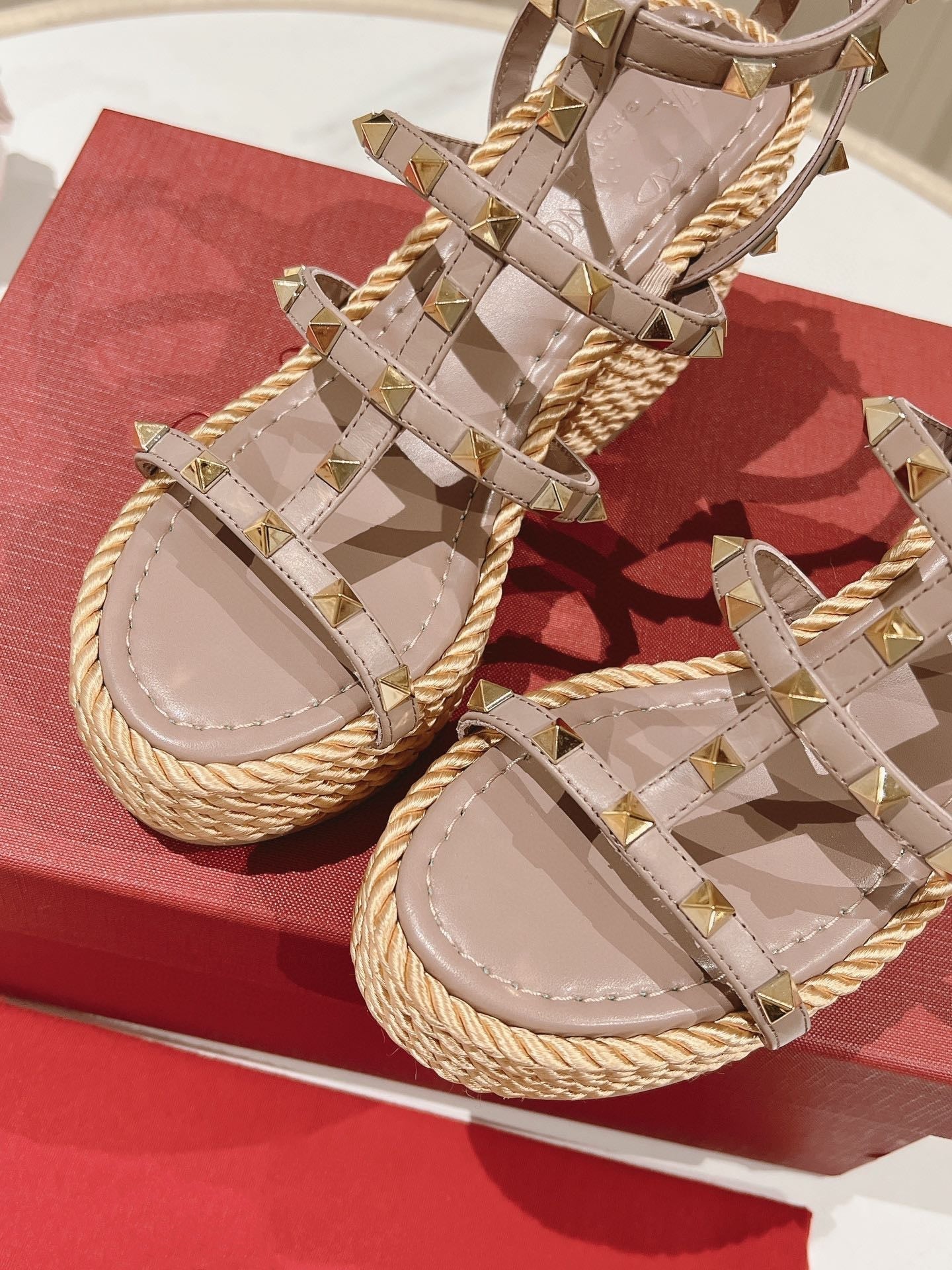 Rockstud Wedge Sandal In Calfskin Leather Poudre 10cm