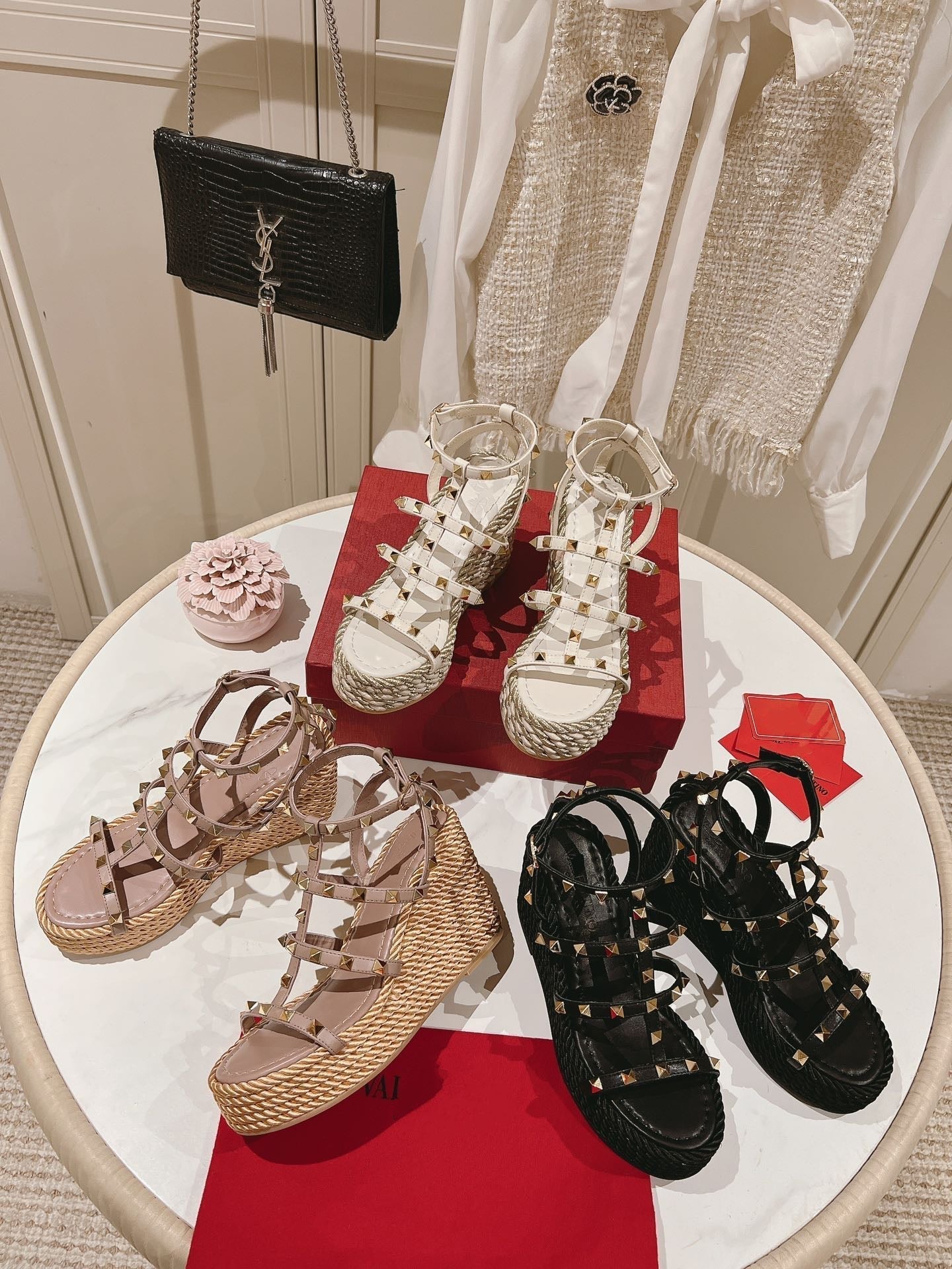 Rockstud Ankle Strap Wedge Sandal Calfskin White 10cm