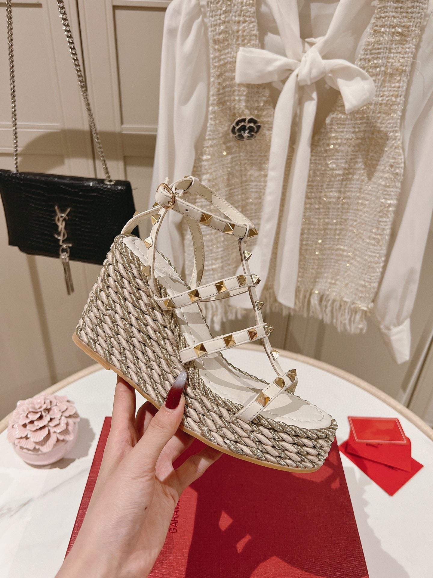 Rockstud Laminated Nappa Wedge Sandal Poudre 10cm