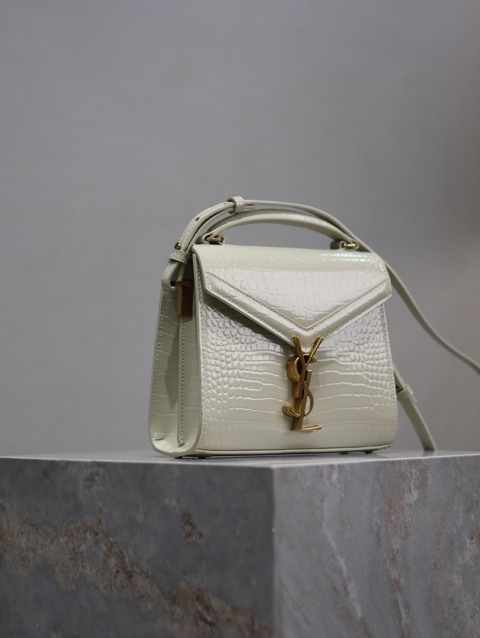 CASSANDRA MINI TOP HANDLE BAG 20 IN WHITE CROCODILE-EMBOSSED GLOSSY CALFSKIN