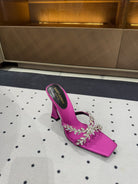 HIGH RHINESTONE CROSS STRAP MULES IN MAGENTA PINK SILK
