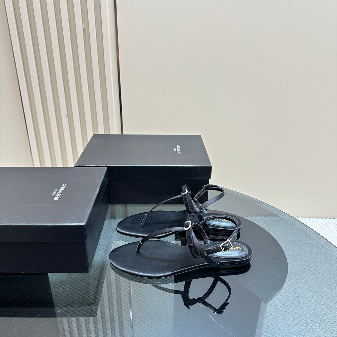 SL CRYSTAL T-STRAP FLAT SANDAL BLACK SATIN
